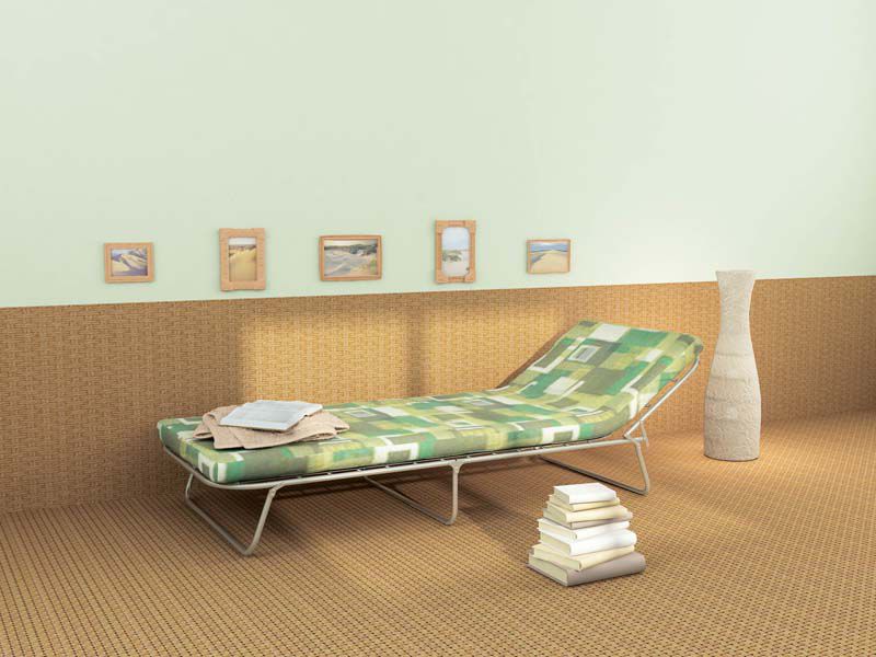 Матрас съемный, толщиной 50 мм. Наполнитель матраса - поролоновая крошка, ткань матраса - бязь. Матрас крепится на силовой ткани, растянутой по периметру рамы на стальных пружинах. Это специальная пропиленовая ткань, которая отличается особой прочностью, устойчивостью к вытягиванию и к влаге.