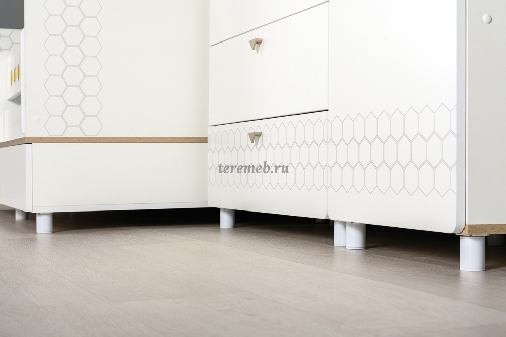 Для защиты напольного покрытия комод установлен на пластиковые опоры регулируемые по высоте, что позволяет легко компенсировать неровности пола.