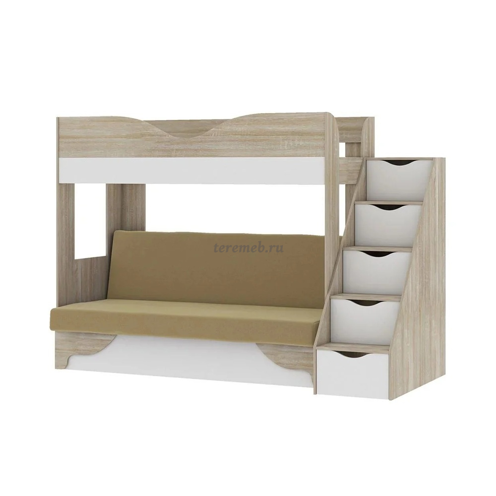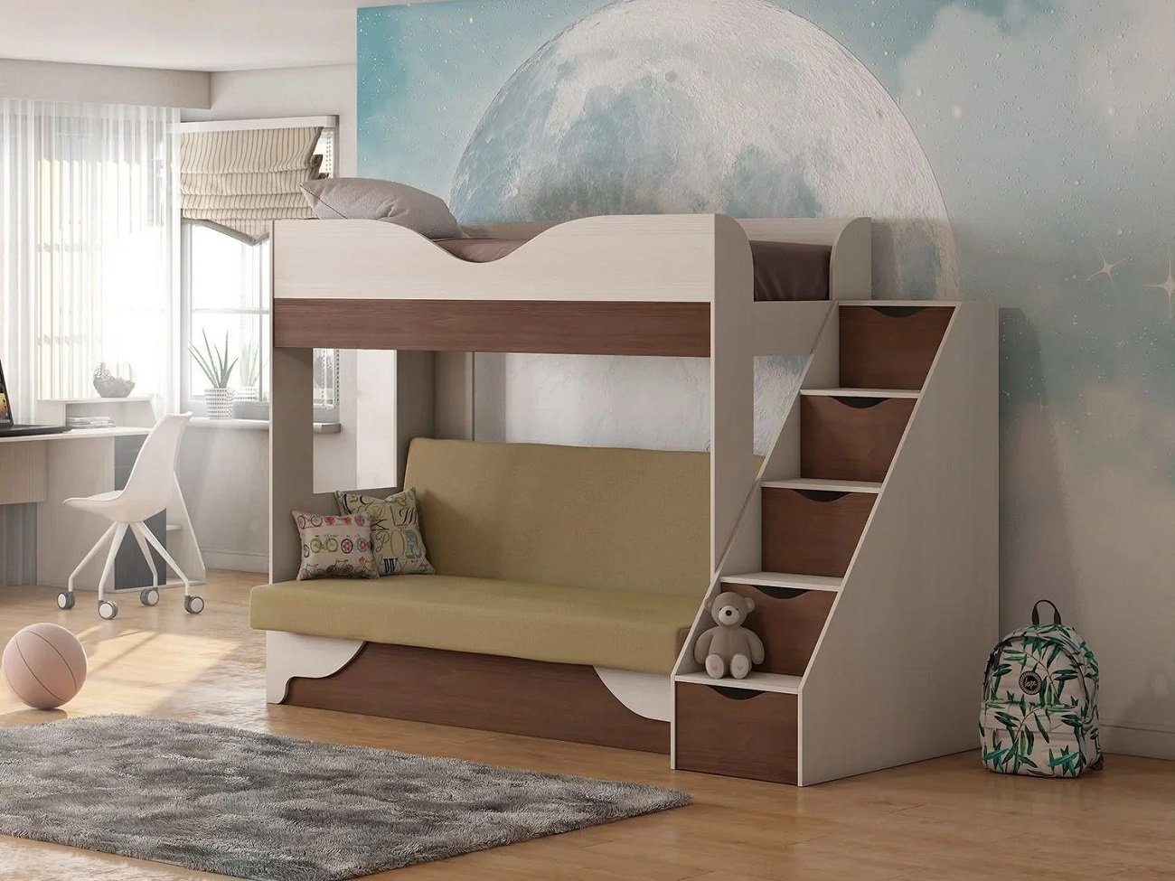 Диван первого яруса имеет механизм трансформации "книжка" с двумя положениями: "диван" и "кровать".