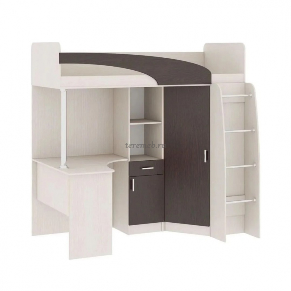 Описание: Кровать-чердак "Карамель 77-01" это отличное решение проблемы нехватки свободного места в детской комнате. На небольшом пространстве умещается кровать с полноценным спальным местом, большой угловой рабочий стол, стеллаж для письменных принадлежностей и игрушек и большой угловой шкаф для одежды.