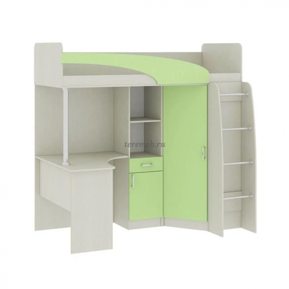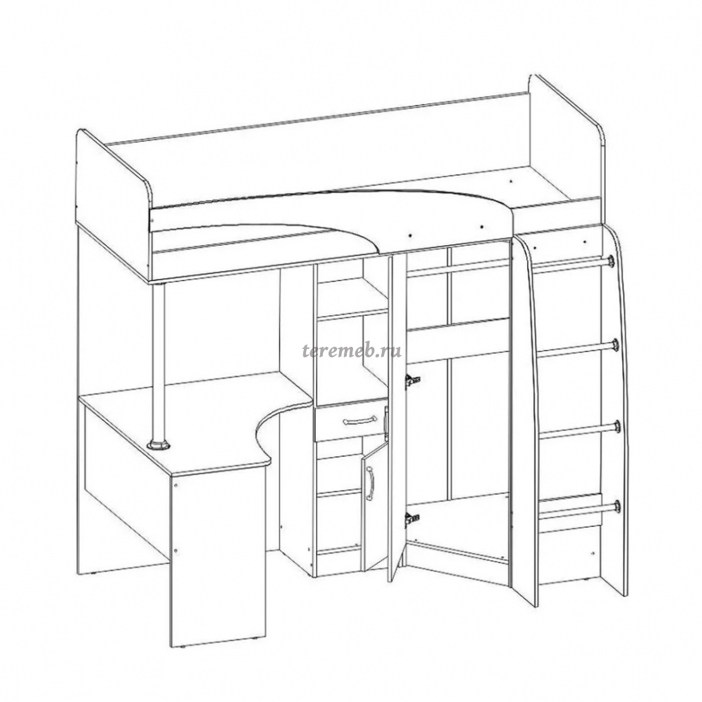 Кровать-чердак "Карамель 77-01" это отличное решение проблемы нехватки свободного места в детской комнате. На небольшом пространстве умещается кровать с полноценным спальным местом, большой угловой рабочий стол, стеллаж для письменных принадлежностей и игрушек и большой угловой шкаф для одежды.