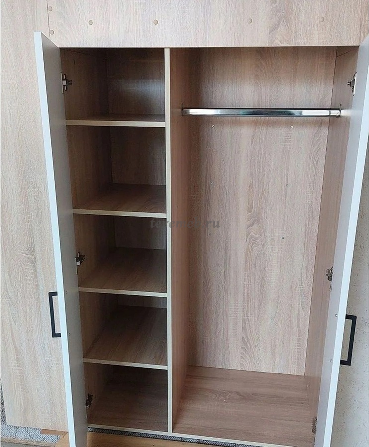 Горизонтальная штанга для одежды в шкафу и ступени лестницы выполнены из хромированного металла.