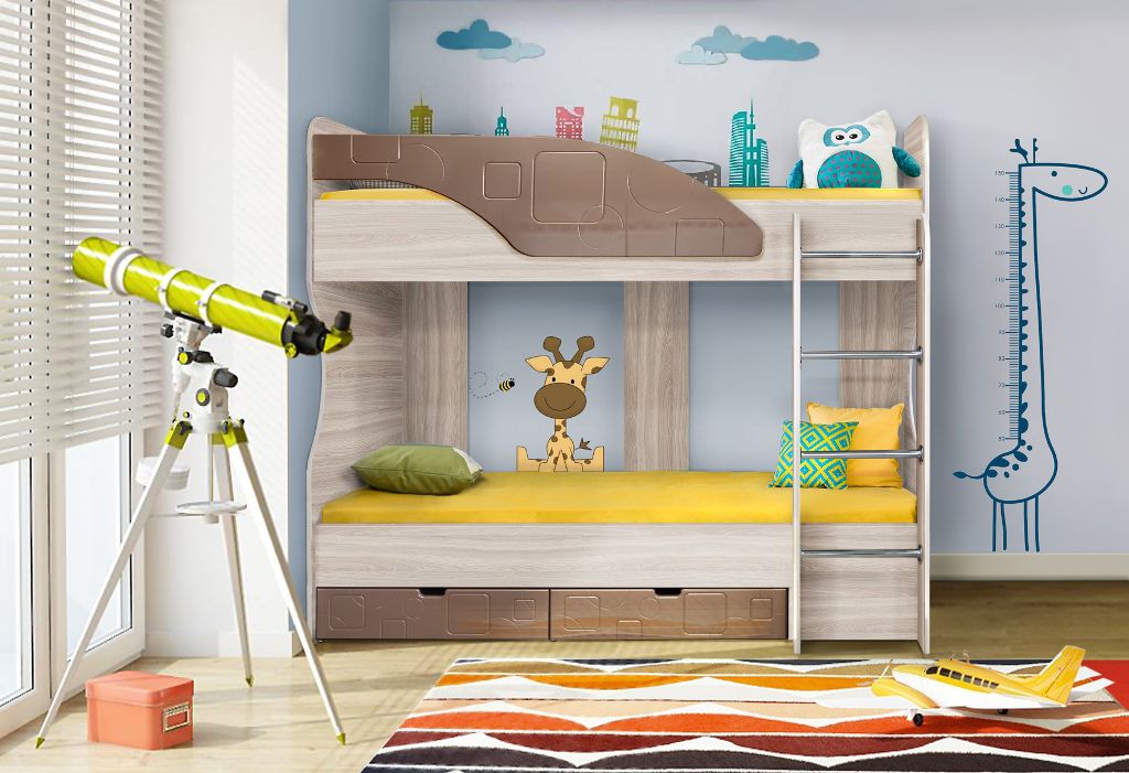 Кровать имеет два комфортных спальных места и два больших выдвижных ящика для белья и игрушек.