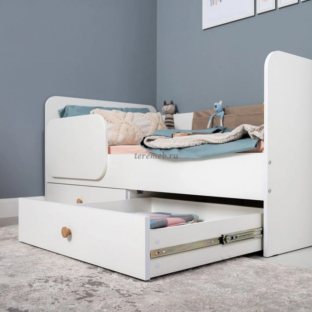 Детская кровать "Джастин 11.55" с защитным бортиком, съёмными тканевыми кармашками и выкатными ящиками идеально подходит для малышей до 3-х лет.