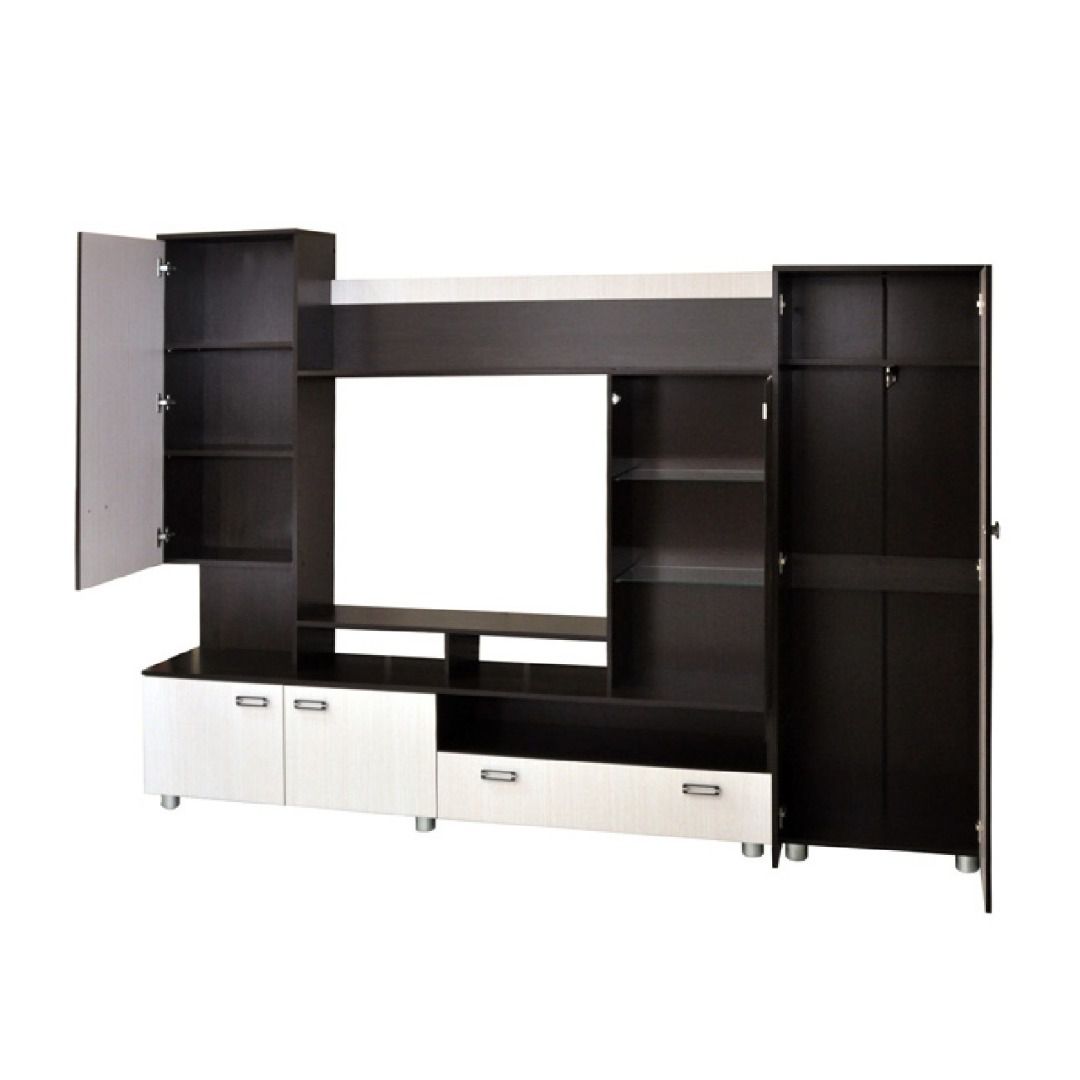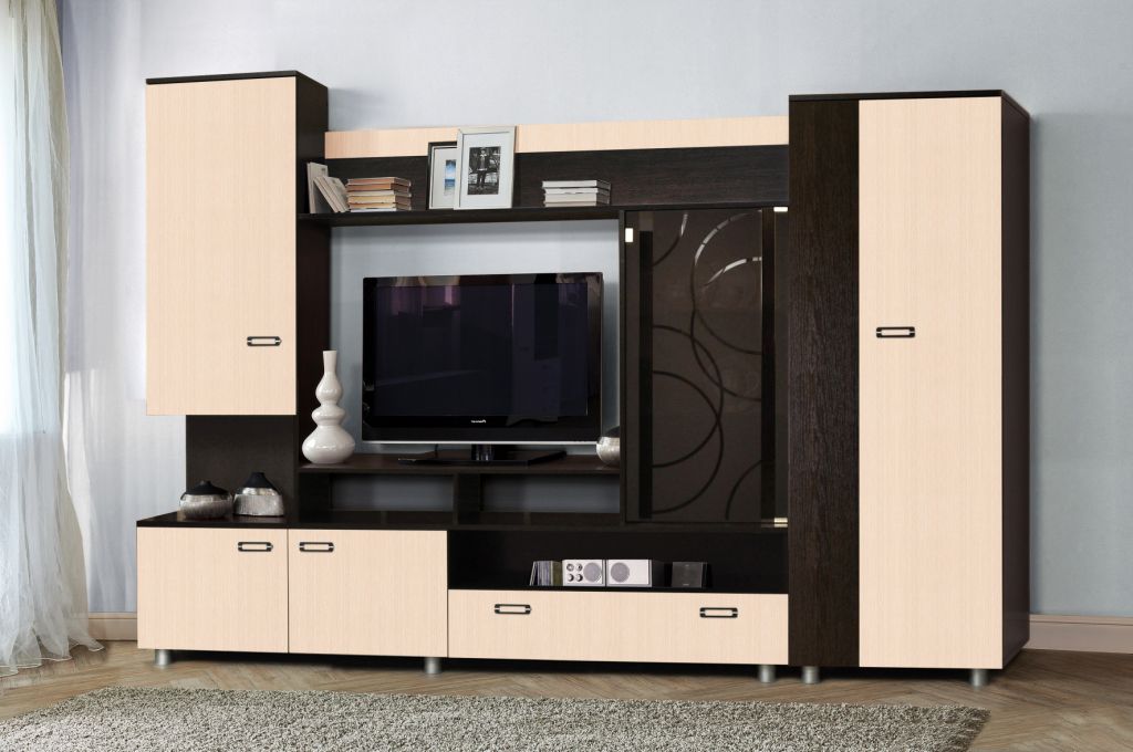 Центральная часть имеет тумбу для TВ оборудована открытыми нишами для размещения аппаратуры. Наверху открытая полка. За тонированной стеклянной дверью с декоративным узором отделение с двумя полками. В нижней тумбе имеется один выдвижной ящик.