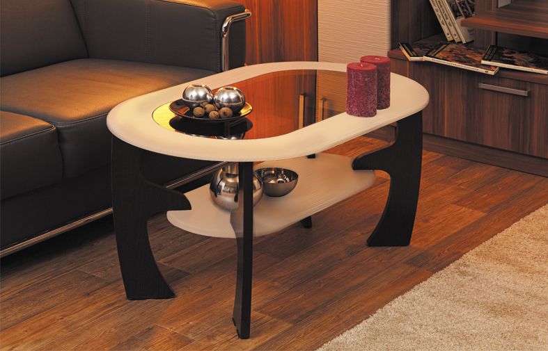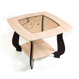 Особую грацию и элегантность столику придаёт столешница со стеклянной вставкой из закалённого тонированного стекла повышенной прочности толщиной 6 мм.