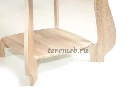 Для хранения книг и газет журналов столик оснащён небольшой полкой, которая вместе со столешницей крепится к плоским изогнутым ножкам.
