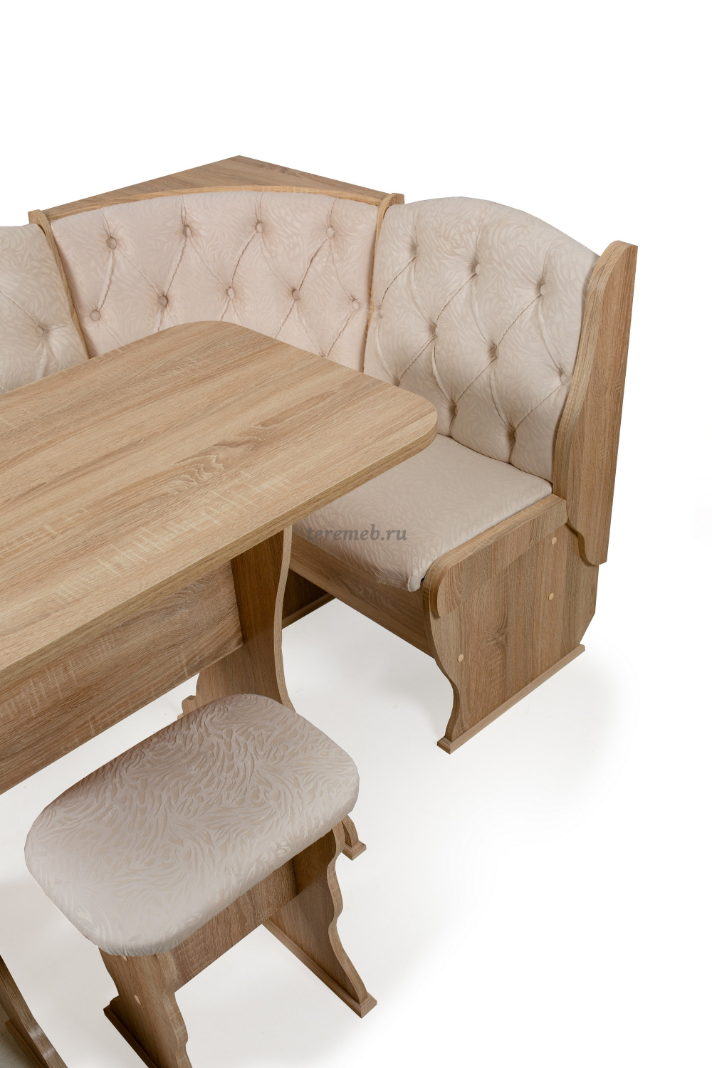 Удобное мягкое сиденье и спинка дивана и табуретов с наполнителем ППУ обиты современной тканью, отличающийся повышенной прочностью и долговечностью.