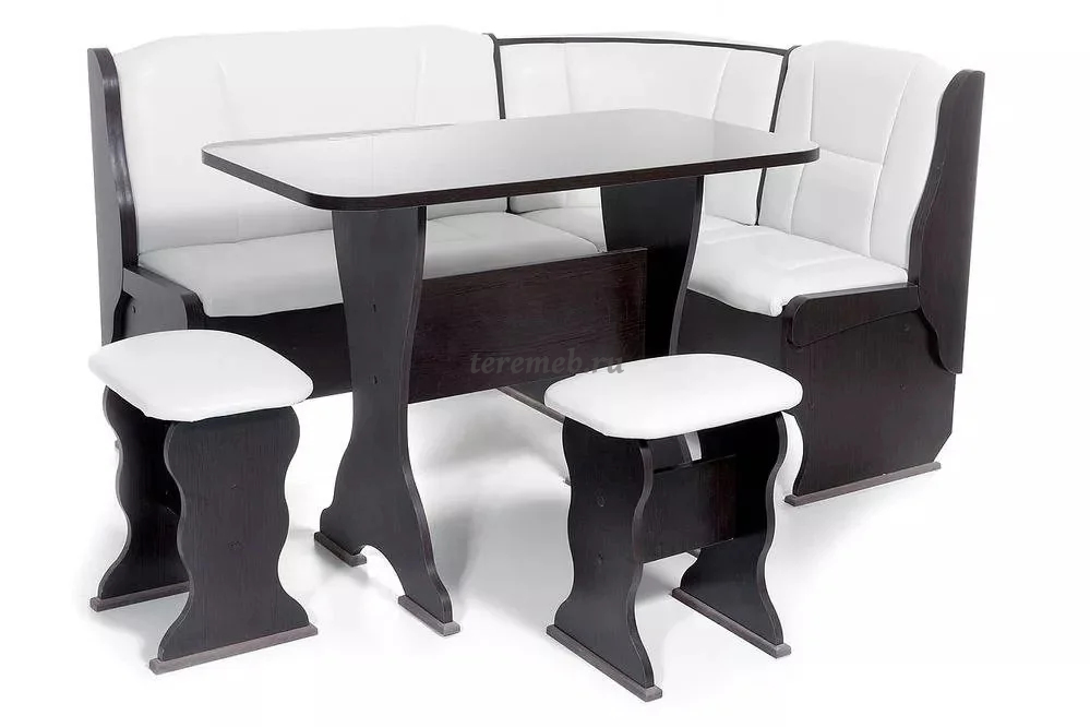 Удобное мягкое сиденье и спинка дивана и табуретов с наполнителем ППУ обиты современной экокожей, отличающийся повышенной прочностью и долговечностью.