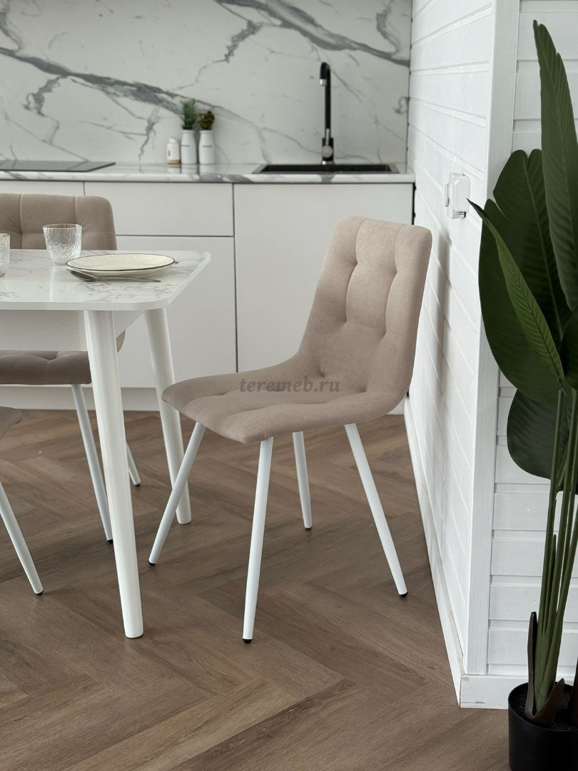 Сиденье и спинка стула мягкие с наполнителем из пенополиуретана стандартной плотности и обтянуты высококачественным износостойкой тканью велюр "Мелисса №3" кремового цвета, что делает данную модель надёжной и неприхотливой в эксплуатации.