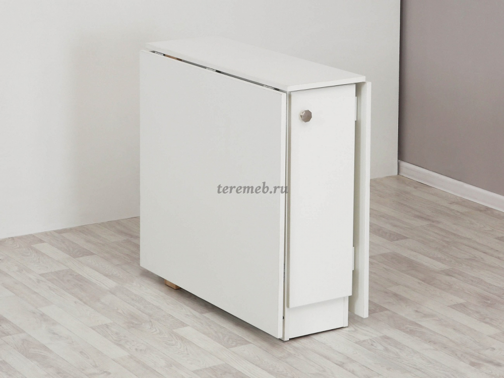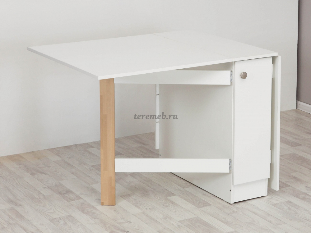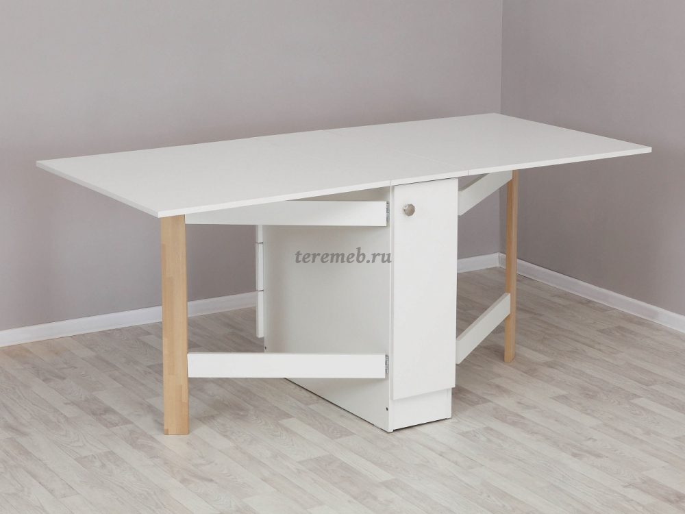 Откидные части столешницы и откидные ножки стола крепятся к тумбе при помощи карточных петель.