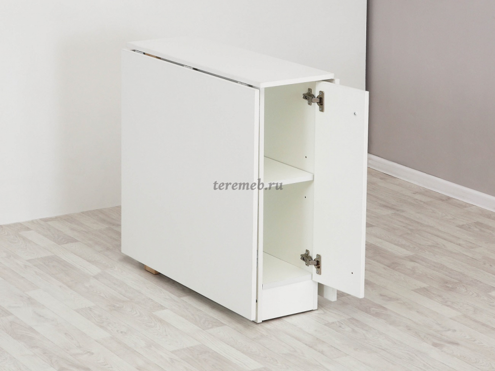 Когда две складные опоры-ножки сдвигаются к центру, крайние секции столешницы складываются и стол превращается в удобную тумбу.