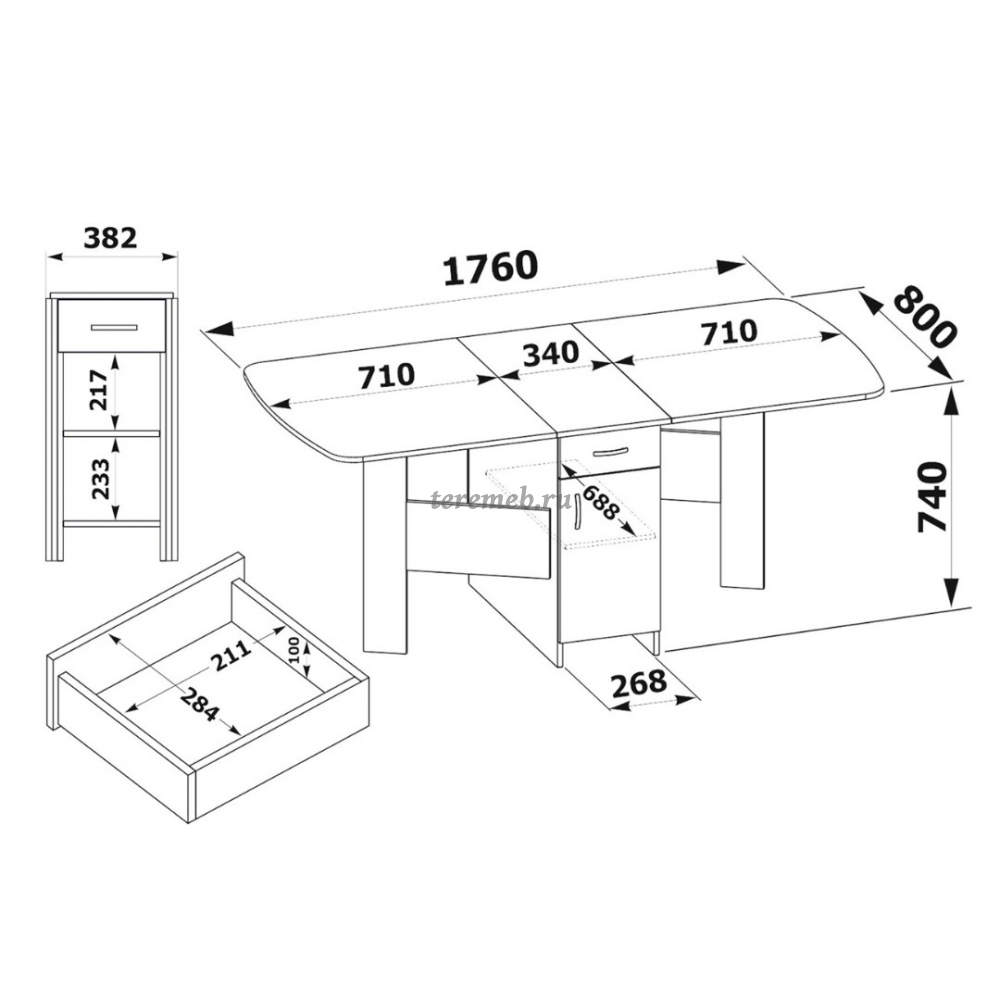 Тумба стола оборудована с обеих сторон выдвижным ящиком и отделением с распашной дверью с одной полкой внутри. Внутренние размеры выдвижного ящика: 211х354 мм.