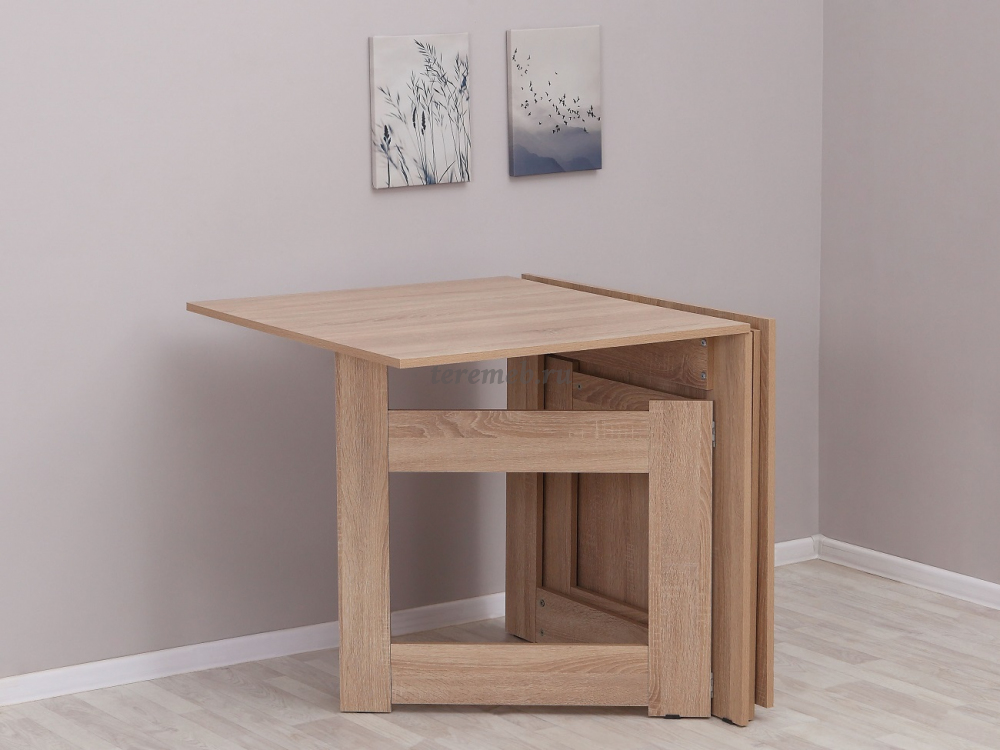 Стол имеет три положения: полностью сложенный, разложенный наполовину или полностью разложенный.