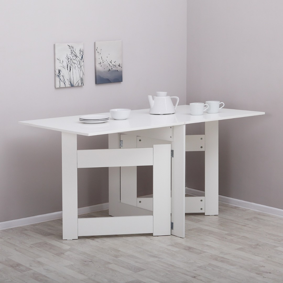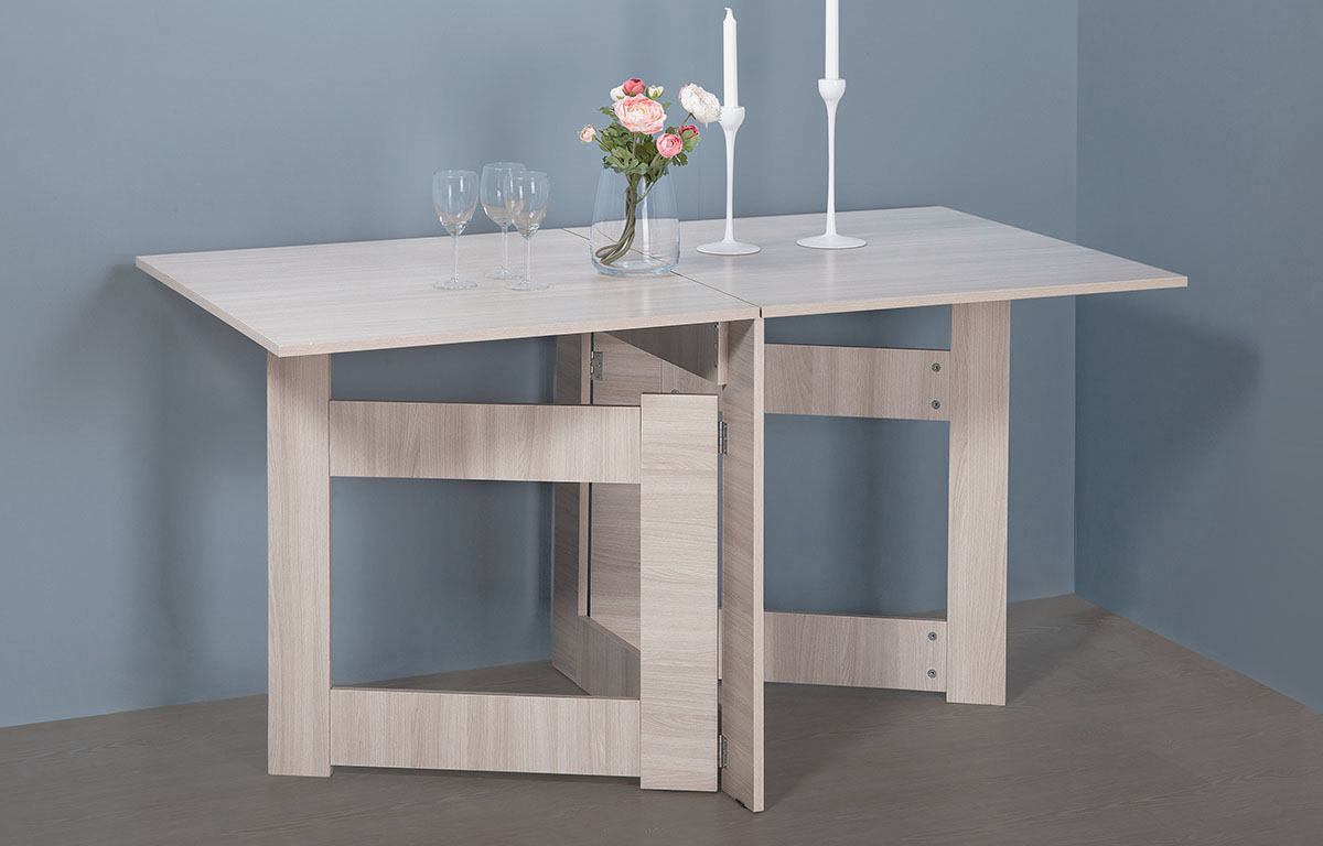 Стол имеет три положения: полностью сложенный, разложенный наполовину или полностью разложенный.