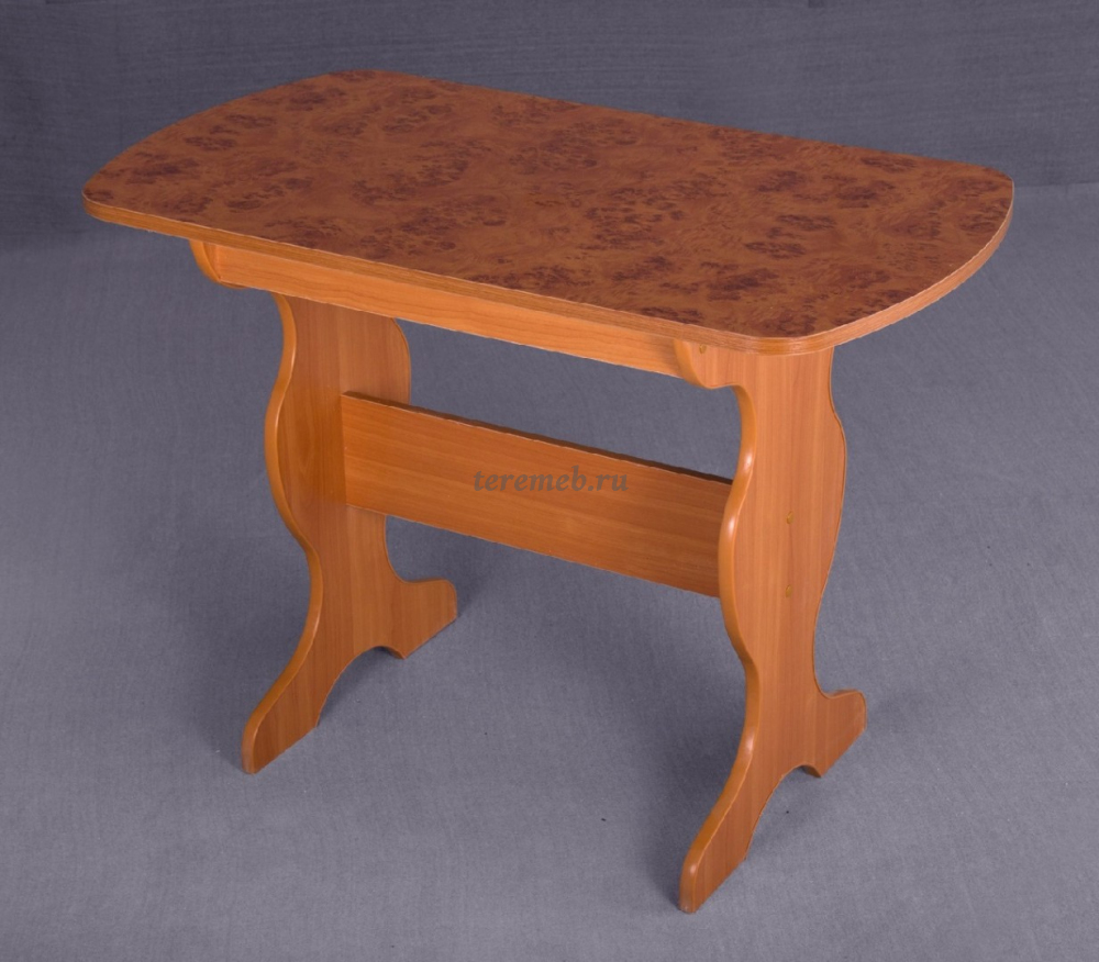 Столешница прямоугольной формы со скруглениями по торцам изготовлена из ДСП, ламинированного слоистым износостойким защитным пластиком высокого давления.