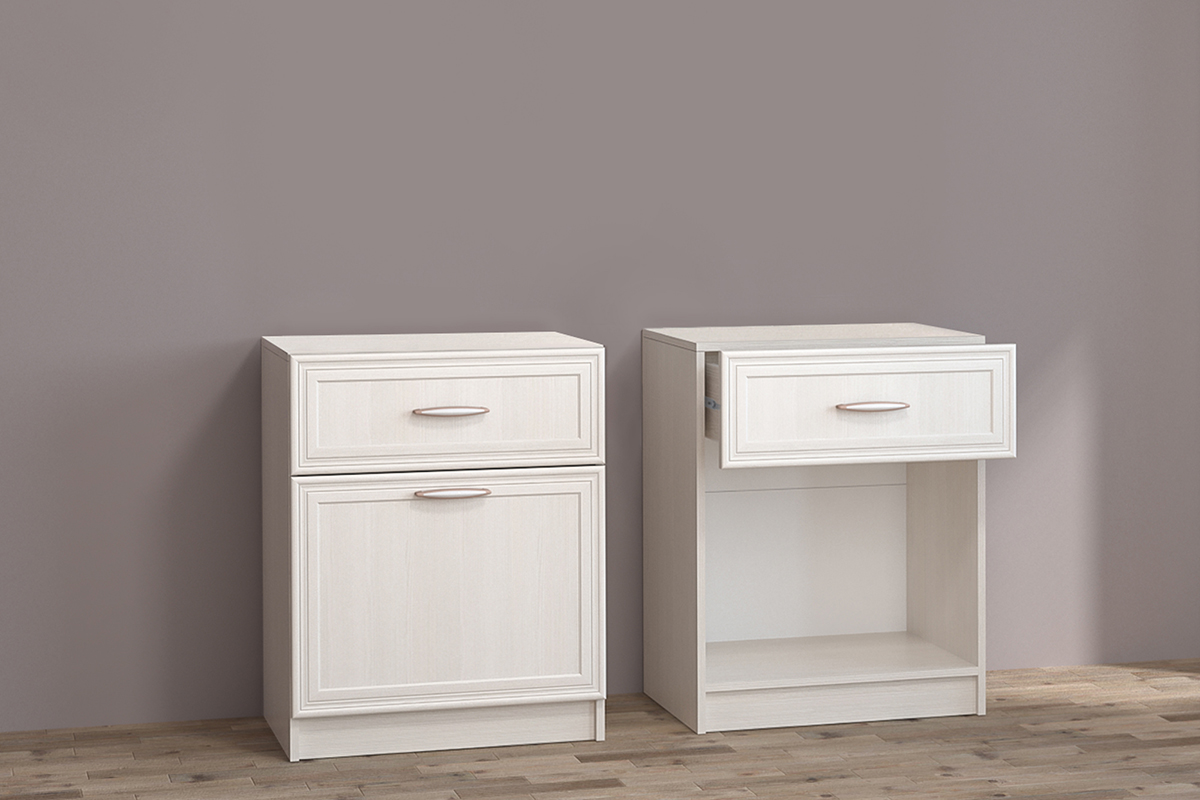 На фасадах установлены изящные ручки из прочного пластика в цвете "антик/белый".