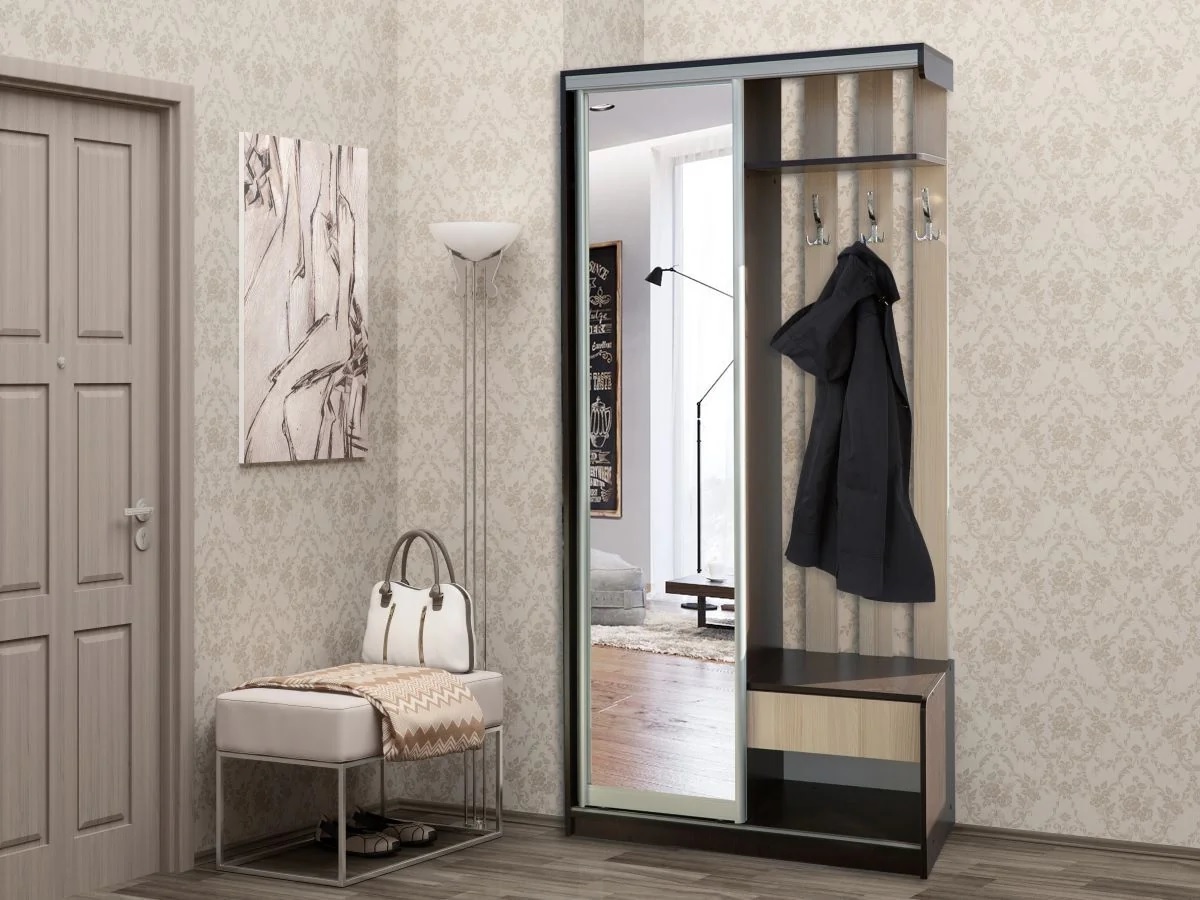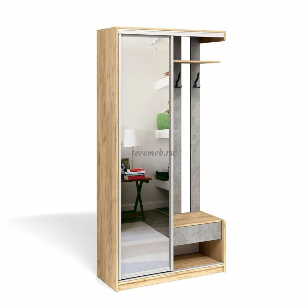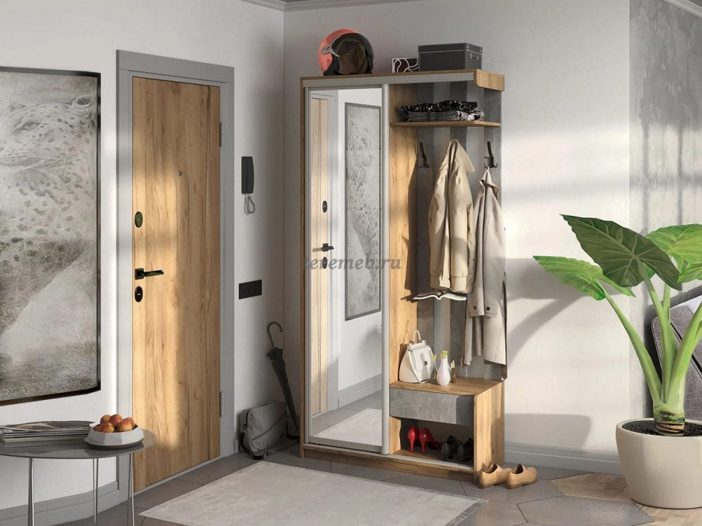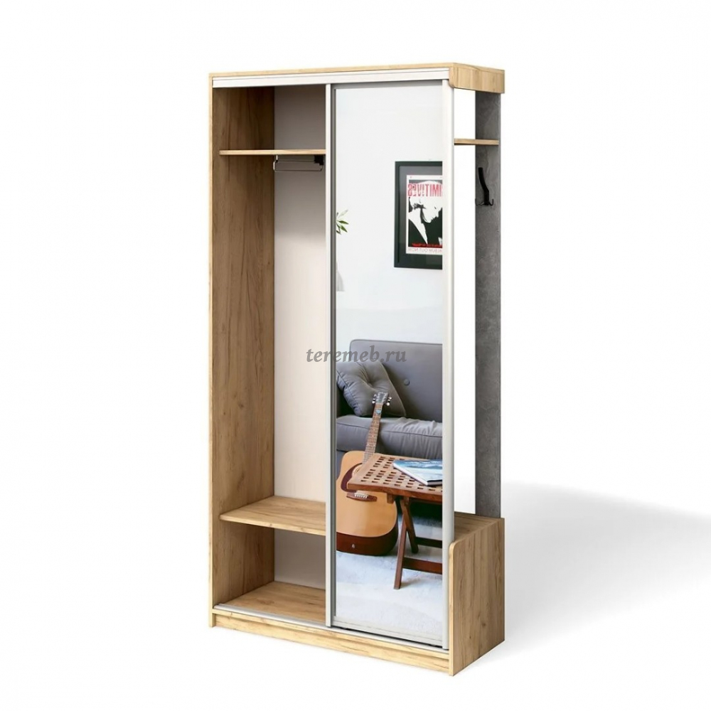 В левой части имеется отделение для верхней одежды с выдвижной вешалкой, а также антресольная полка для головных уборов и полка для обуви.
