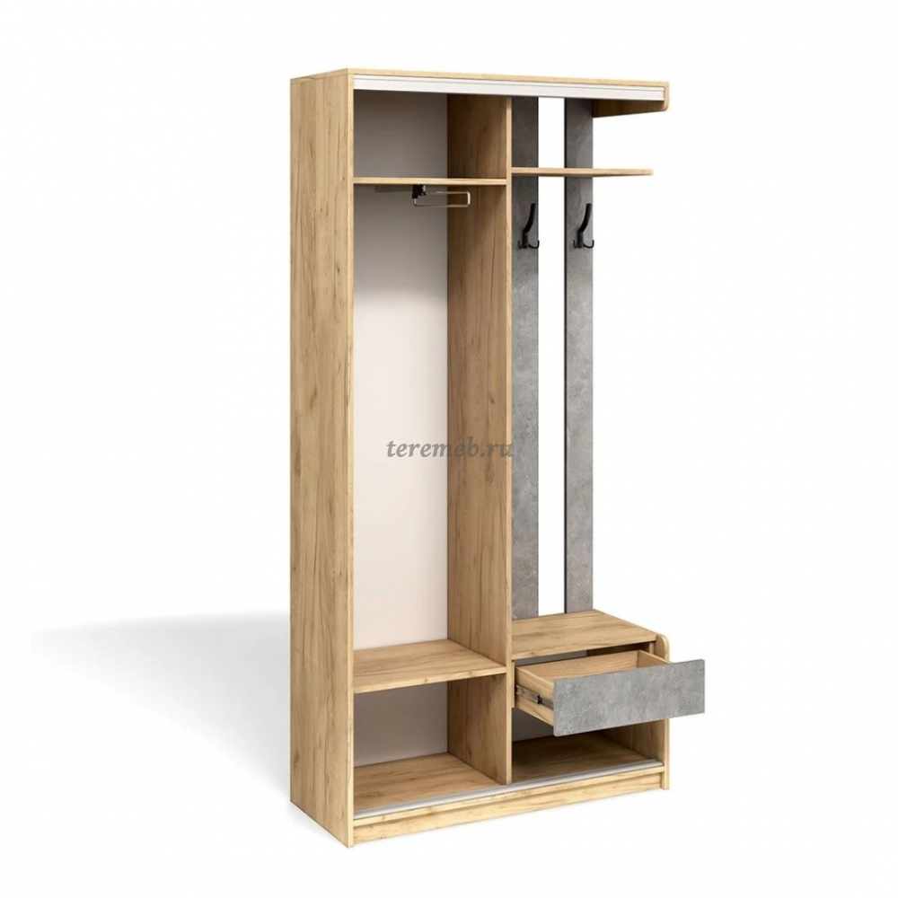 В правой части - отделение с открытой вешалкой с тремя трехрожковыми крючками, антресольной полкой и тумбой для обуви. Выдвижной ящик для хранения средств ухода за обувью и прочих мелочей установлен на роликовых направляющих.