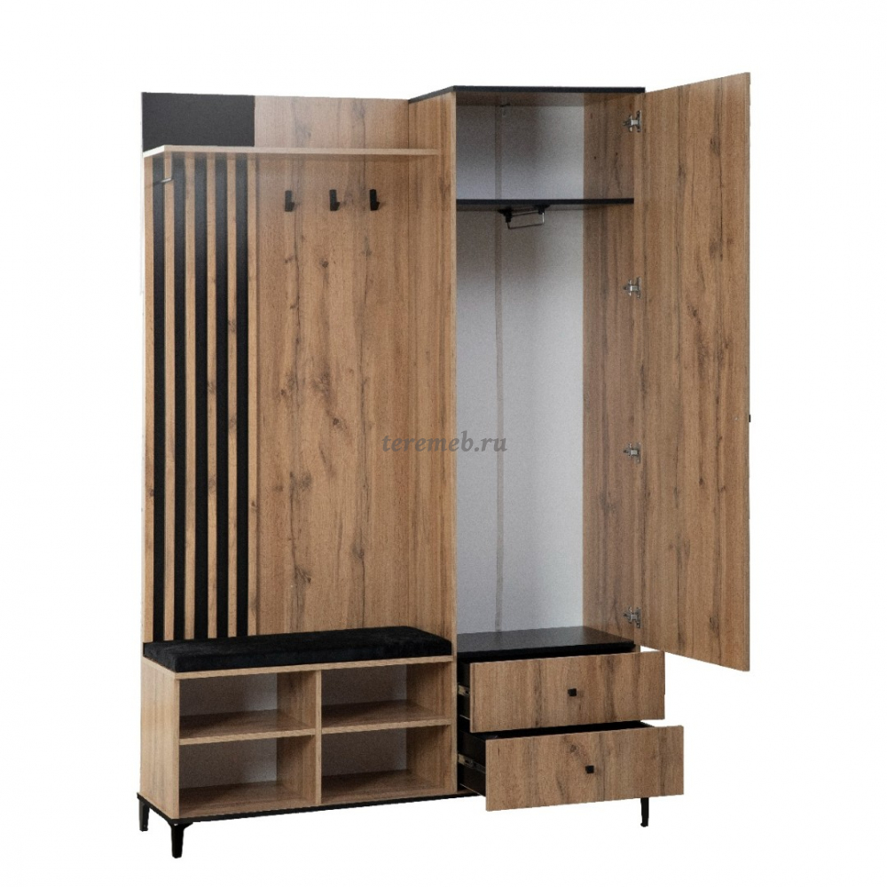 В левой части открытую вешалку с тремя крючками, полку для головных уборов, металлическую штангу для одежды, а также открытые ниши.