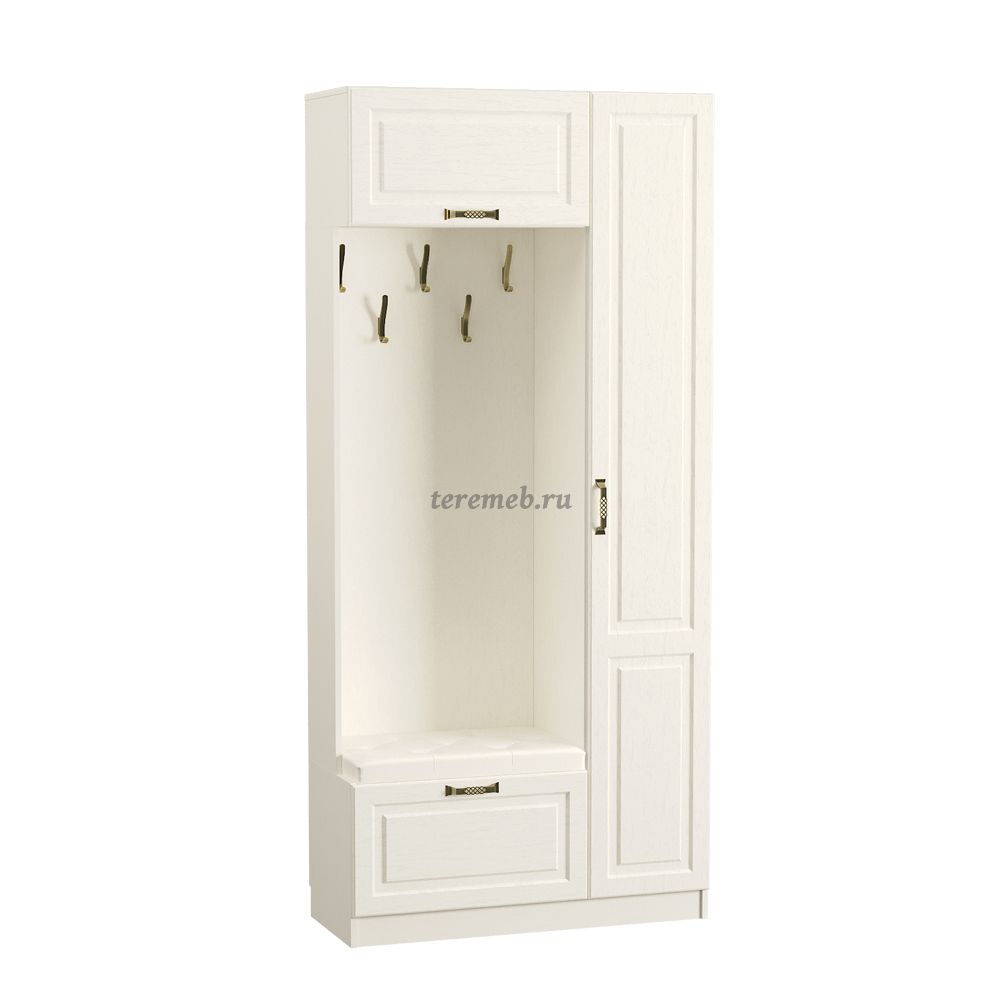 Скромные габариты вмещают закрытый шкаф с пятью полками, открытуюсекцию для одежды с пятью двурожковыми крючками, удобную антресольную полку для головных уборов и нижнюю тумбу для обуви.