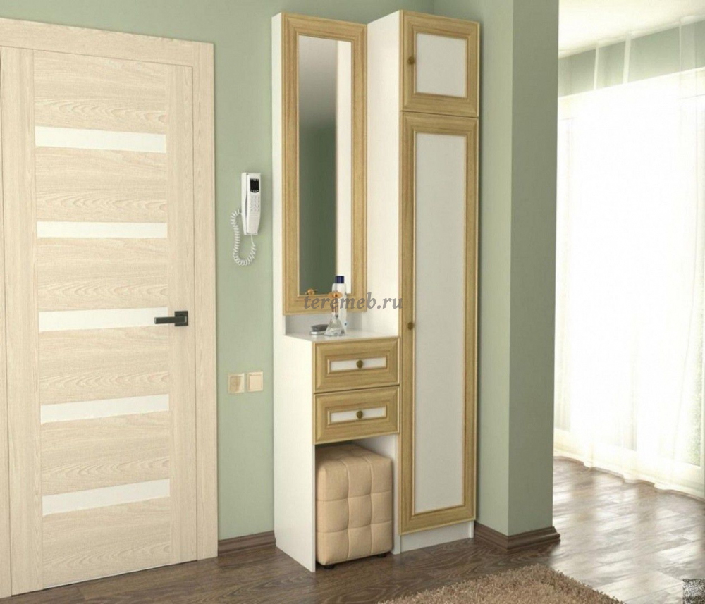 Корпус прихожей изготовлен из высококачественного ЛДСП толщиной 16 мм, фасады — из качественного погонажного рамочного профиля МДФ соответствуют по цветовой гамме с заполнением МДФ 4 мм и дополнены современными ручками из прочного пластика в цвете "металлик".