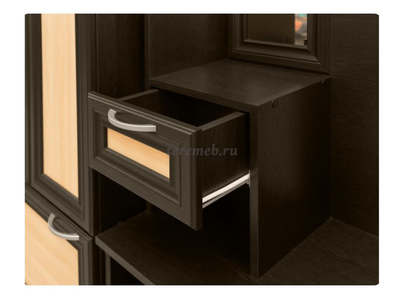 Корпус прихожей изготовлен из высококачественного ЛДСП толщиной 16 мм, фасады - из качественного погонажного рамочного профиля МДФ соответствуют по цветовой гамме с заполнением МДФ 4 мм и дополнены ручками из прочного пластика в цвете "металлик". Торцы изделий обработаны кромкой ПВХ-0,4 мм.