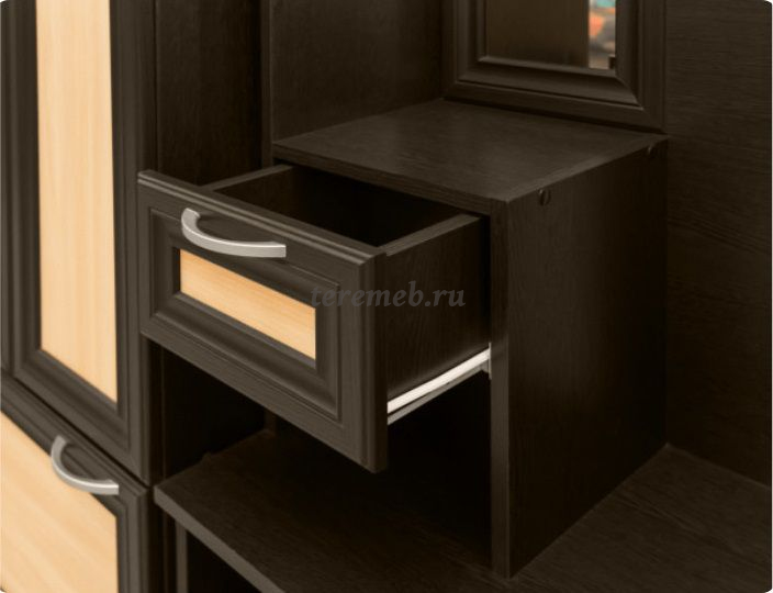 За распашной дверью с зеркалом находится отделение с 2-я полками, внизу выдвижной ящик для мелочей.
