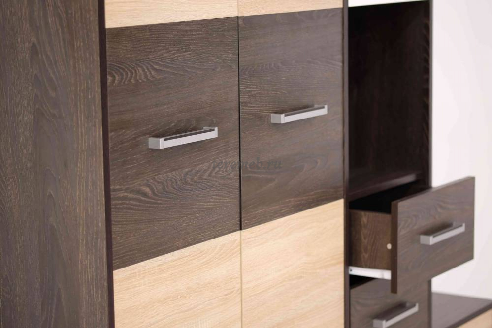 За распашной дверью с зеркалом находится отделение с двумя полками. Под зеркалом имеется открытая ниша и два выдвижных ящика для хранения мелких вещей.