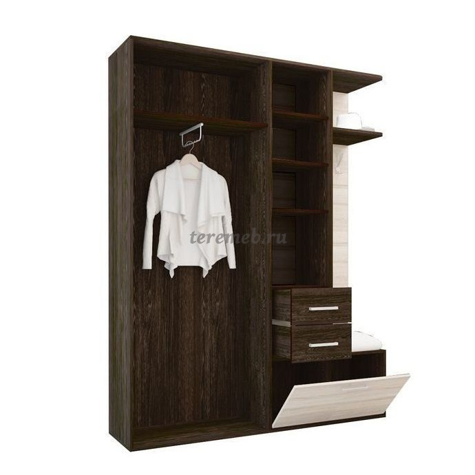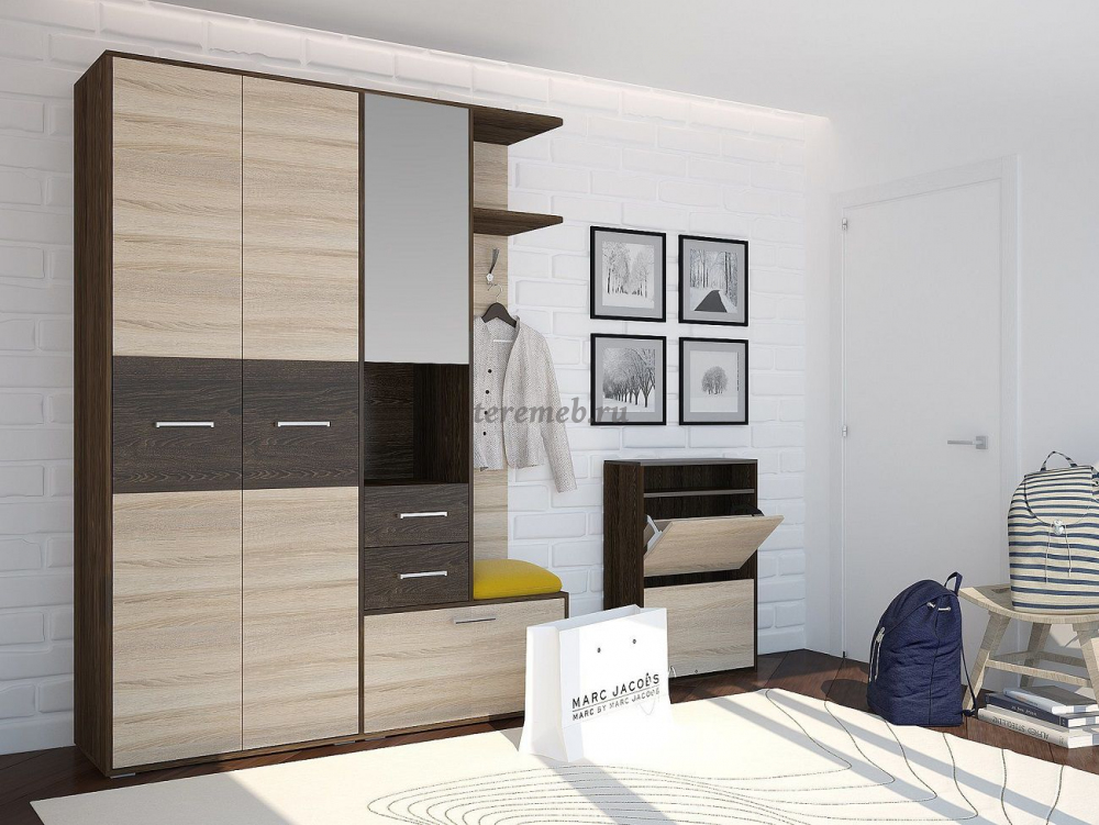 Прихожая состоит из открытой вешалки, зеркала с ящиками, тумбы для обуви и шкафа для одежды.