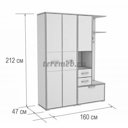 Внизу размещается тумба для обуви с откидной дверью, внутри которой находятся две ниши без полок.