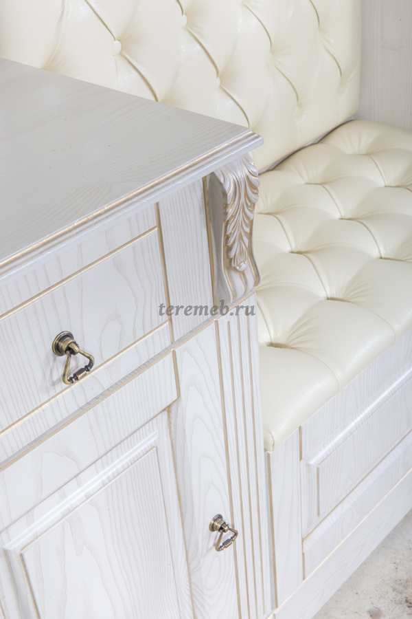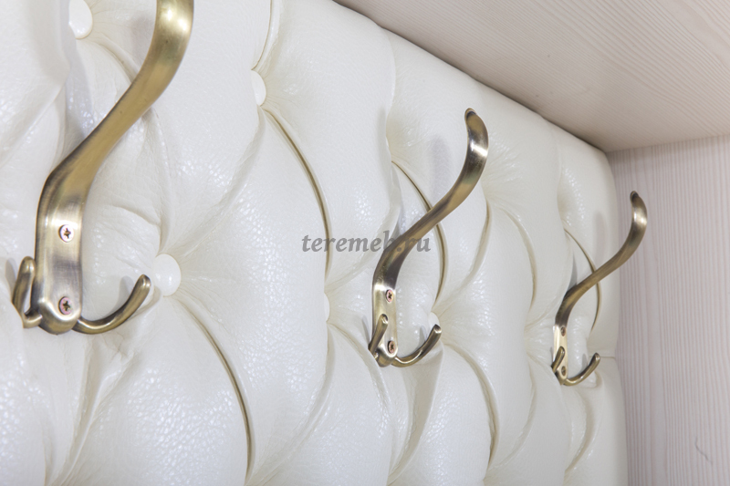 Мягкое сидение и панно под вешалку обиты высококачественной экокожей кремового цвета с наполнителем из ППУ и декорированы каретной стяжкой. Глубина сиденья 420 мм.