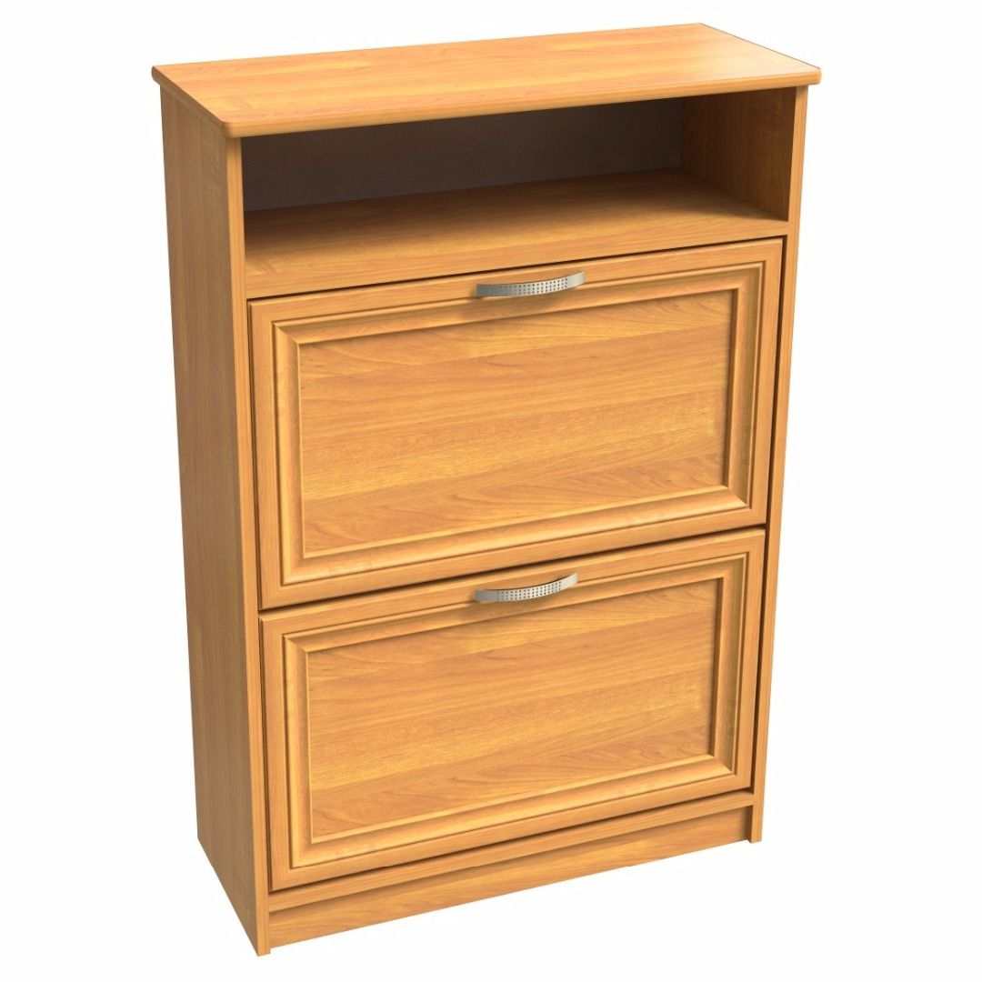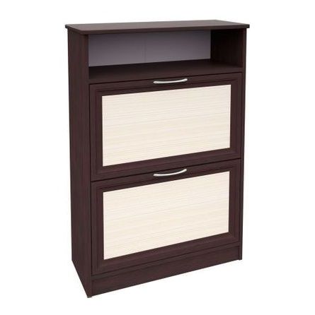 Тумба оборудована двумя откидными секциями под обувь, рассчитанных на 12 пар обуви и открытой нишей для мелких предметов в верхней части.