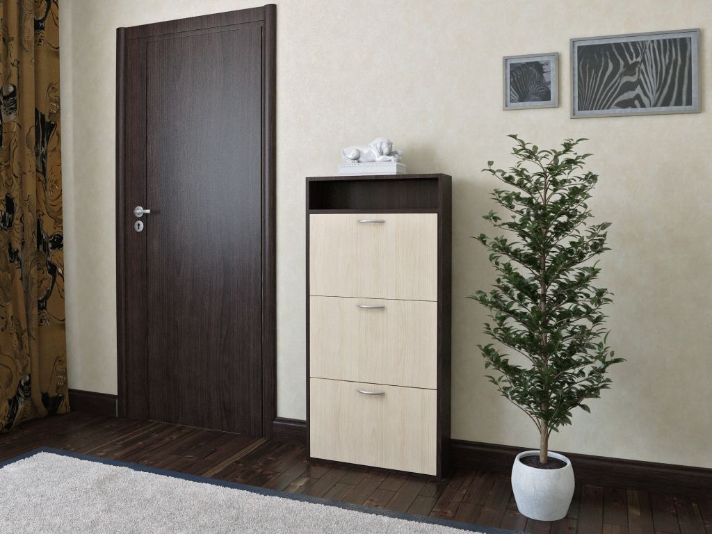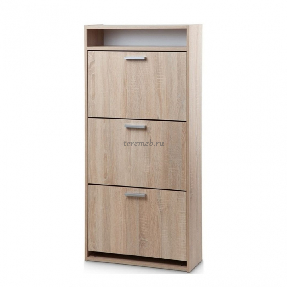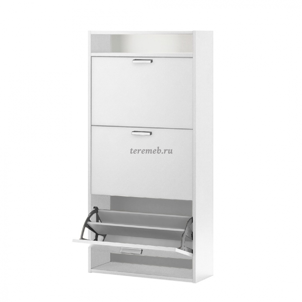 Тумба оборудована тремя откидными секциями, рассчитанных на 18 пар обуви. В верхней части тумбы над секциями расположена открытая ниша для мелких предметов.
