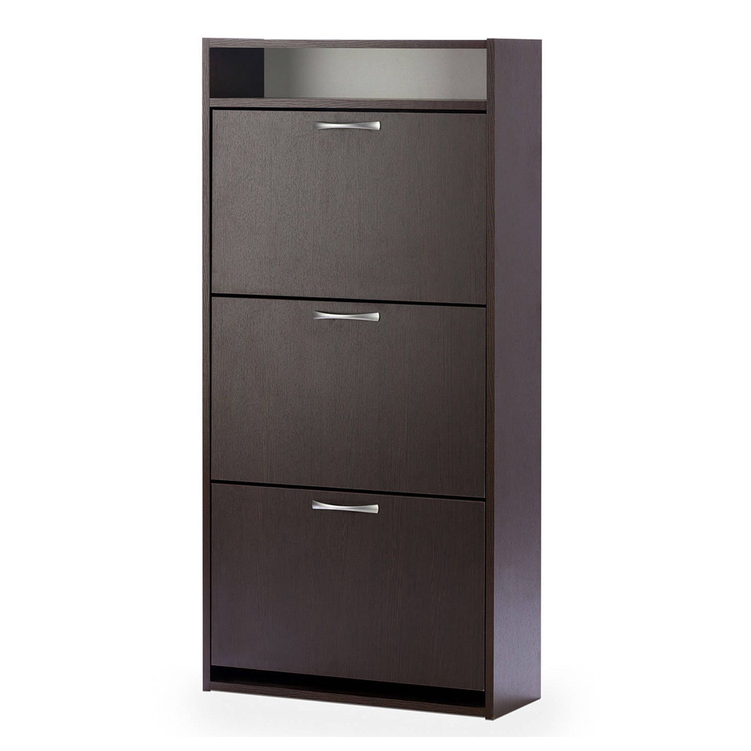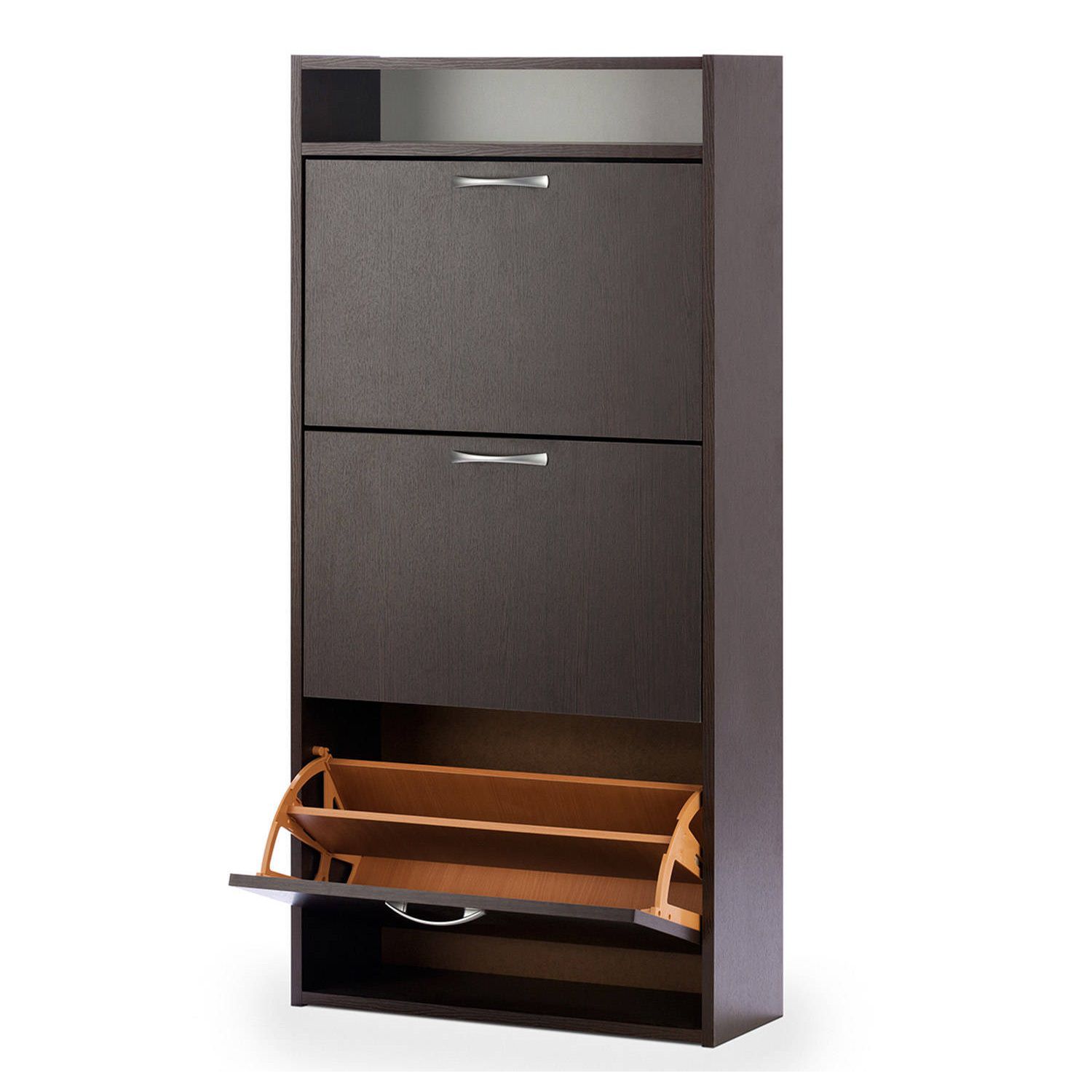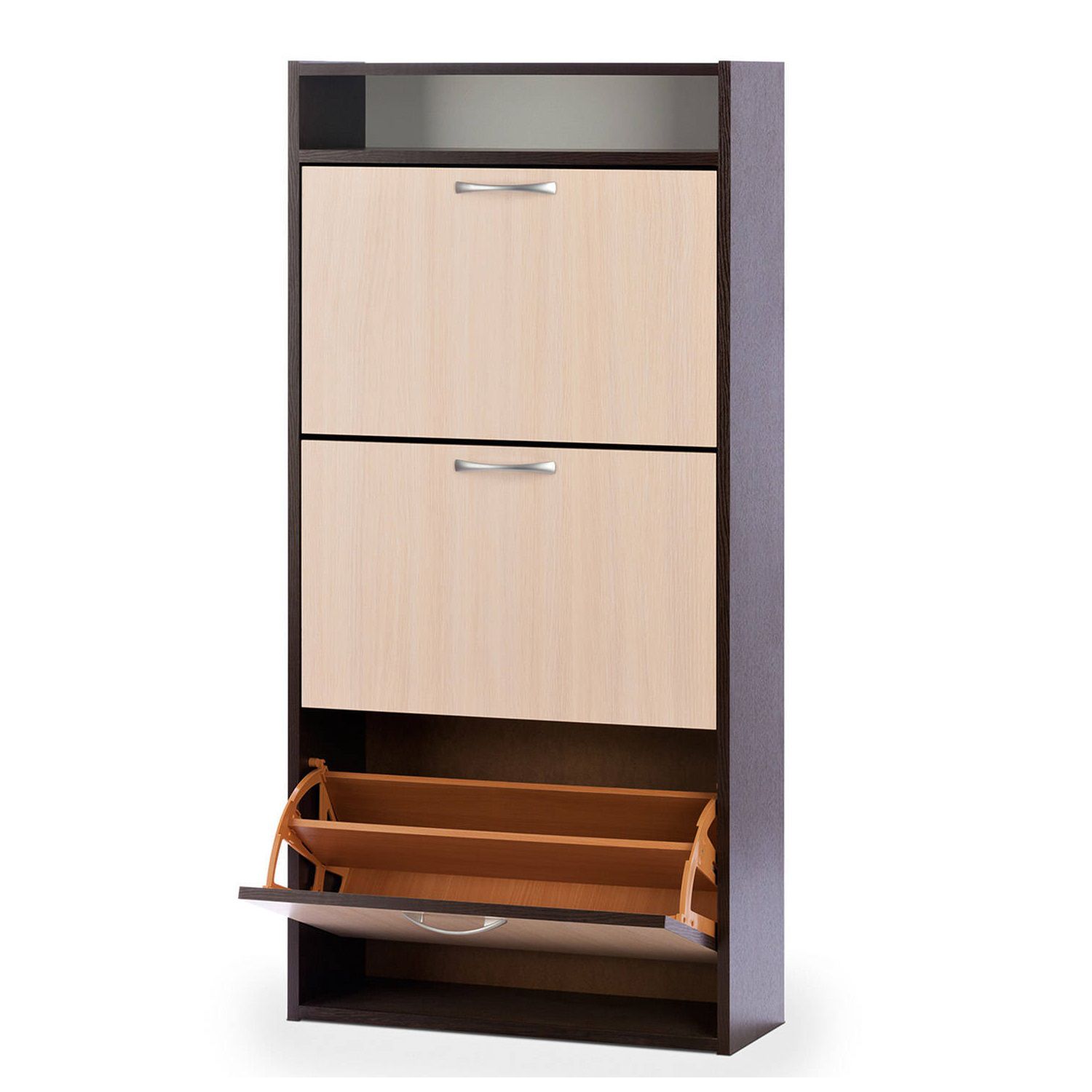 Тумба оборудована тремя откидными секциями, рассчитанных на 18 пар обуви. В верхней части тумбы над секциями расположена открытая ниша для мелких предметов.