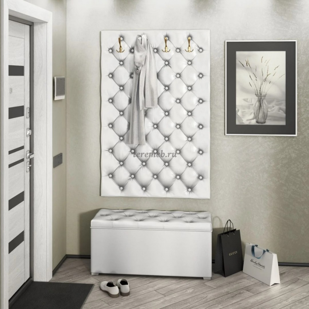 Описание: Мягкая стеновая панель-вешалка с каретной стяжкой "Мишель 950" наполнит уютом любую прихожую. Стеновая панель выполнена с классической каретной стяжкой и имеет четыре 3-х рожковых крючка для размещения верхней одежды и головных уборов.