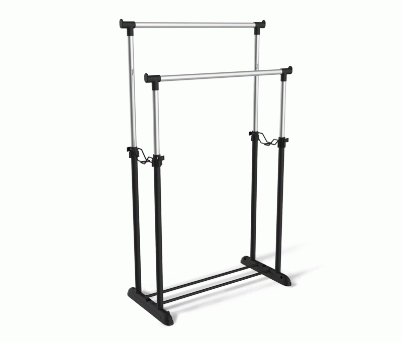 Стойки изготовлены из металлических труб диаметром 28 и 32 мм и толщиной 0,8 мм. Высота вешалки регулируется в пределах 895-1610 мм (телескопическая система раздвижения).