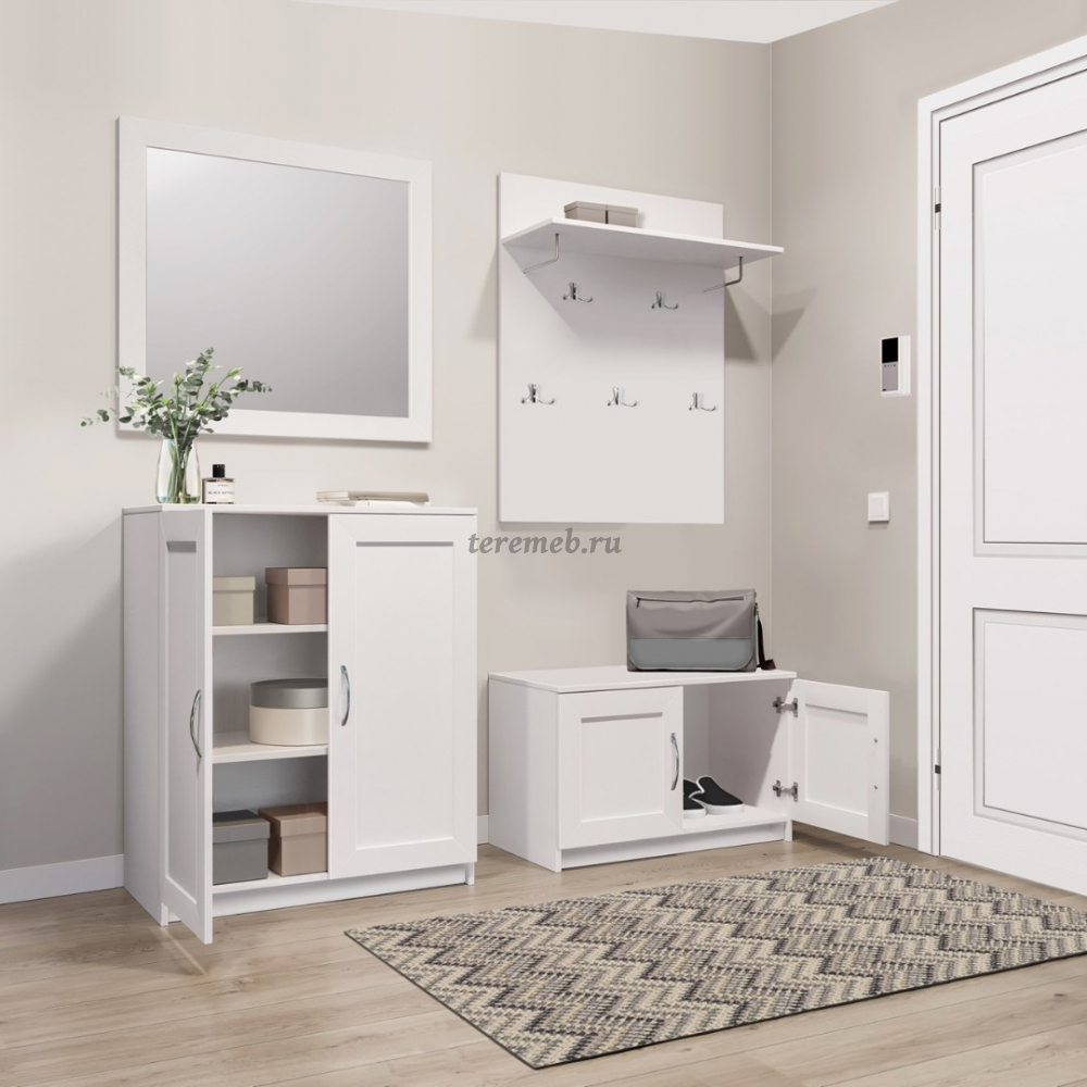 Вешалка оборудована полочкой для головных уборов, пятью 2-х рожковыми крючками для одежды, сумок, зонтов, двумя кронштейнами для плечиков.