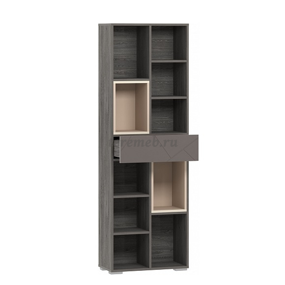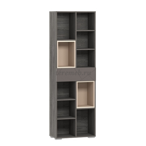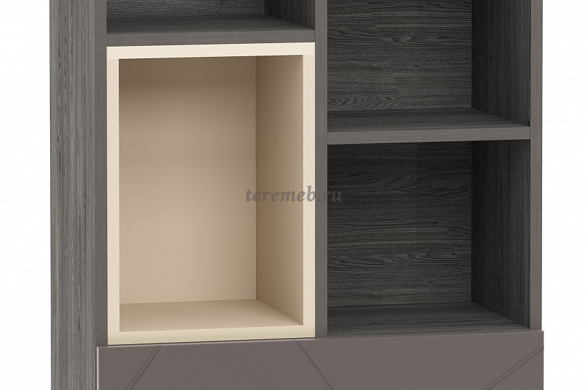 Фасад выдвижного ящика выполнен из современного МДФ и декорирован софтом. Трендовый цвет "графита" и стильная геометрия фрезеровки, которая сочетает в себе имитацию колотого камня с поверхностью "soft toush", придаёт модулю ультрамодный вид.