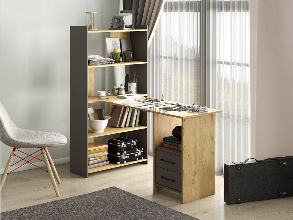 Стеллаж имеет три высоких полок над столом для хранения документов и бумаги, а также две полки под ним, которые удобно использовать под системный блок компьютера или для установки оргтехники.