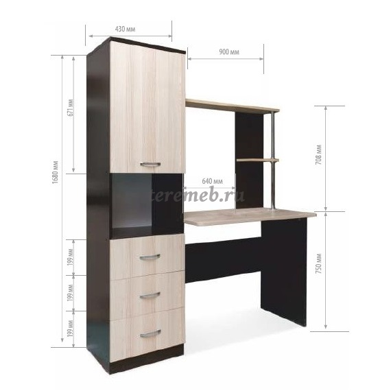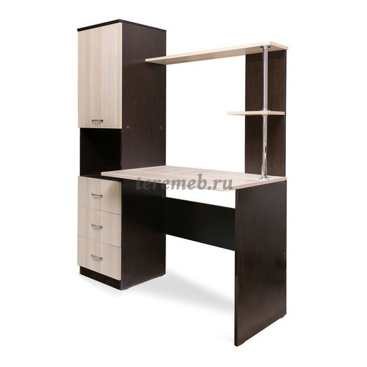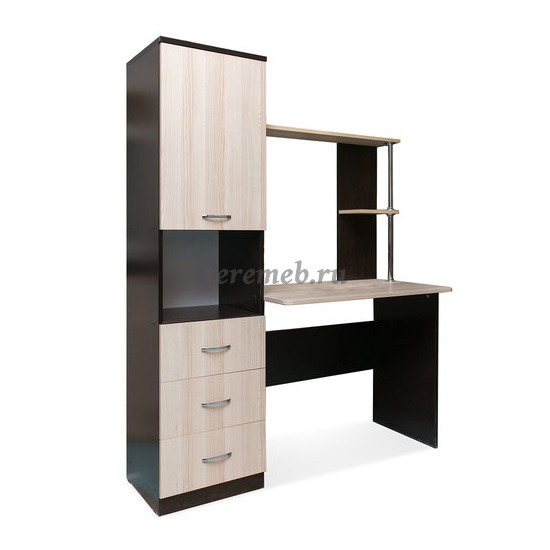Шкаф-колонка в нижней части имеет тумбу с тремя выкатными ящиками, установленными на роликовых направляющих. Верхняя часть имеет отделение с распашной полкой, за которой установлена одна полка. В центральной части колонки имеется открытая ниша для оргтехники и бумаги.