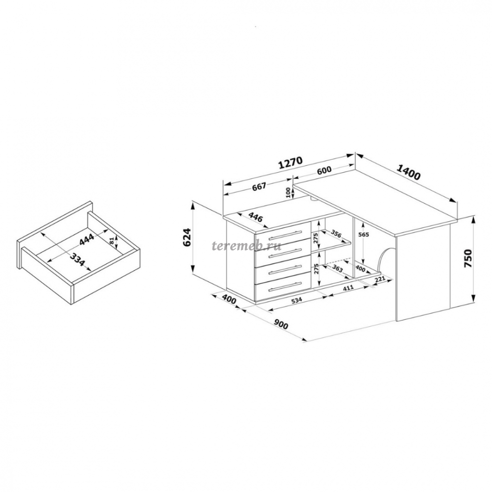 Габариты выдвижных ящиков (ДхГхВ): 334х81х444 мм.