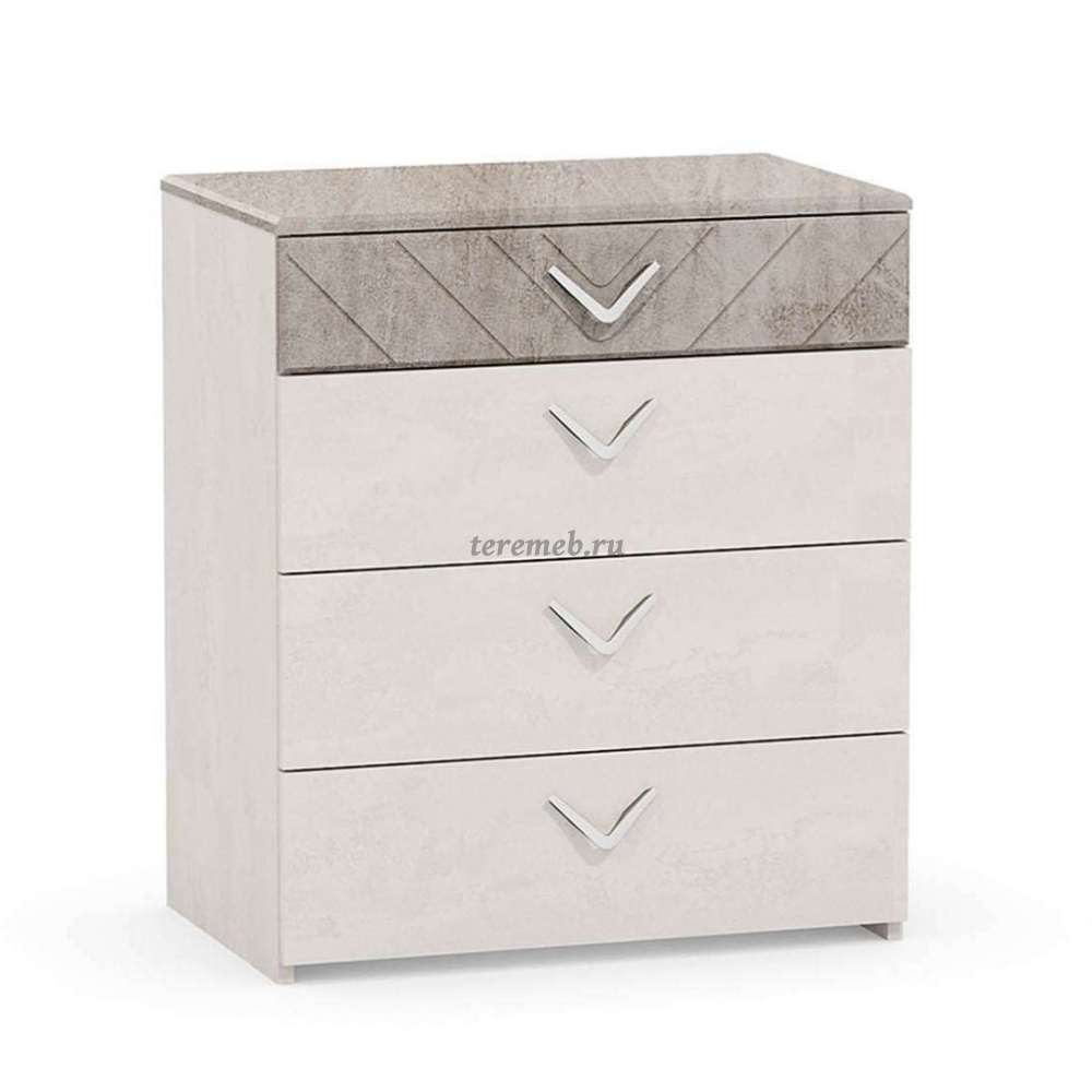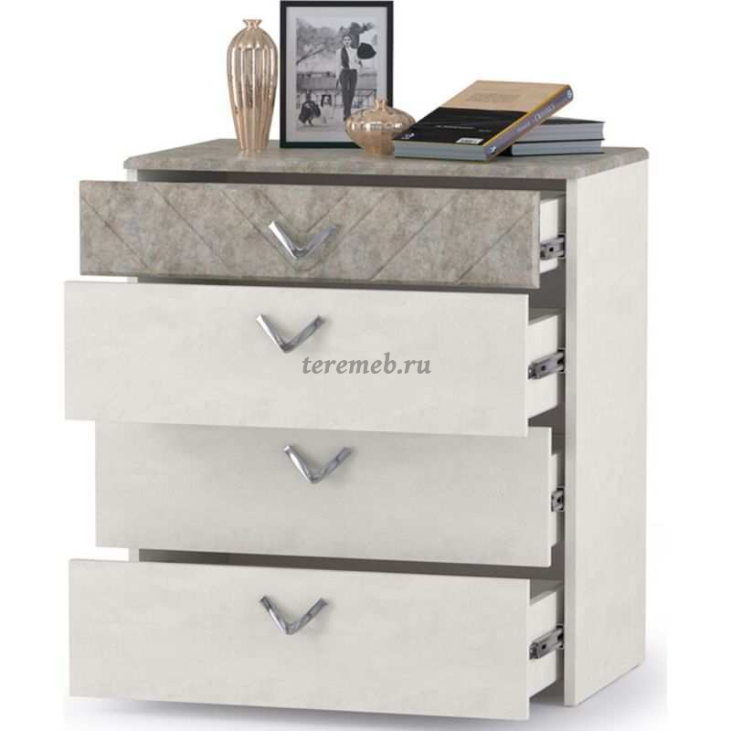 Верхний фасад и крышка комода выполнены из современного МДФ с декоративной профильной вырезкой и дополнены ручками из металлического плава в цвете "хром".