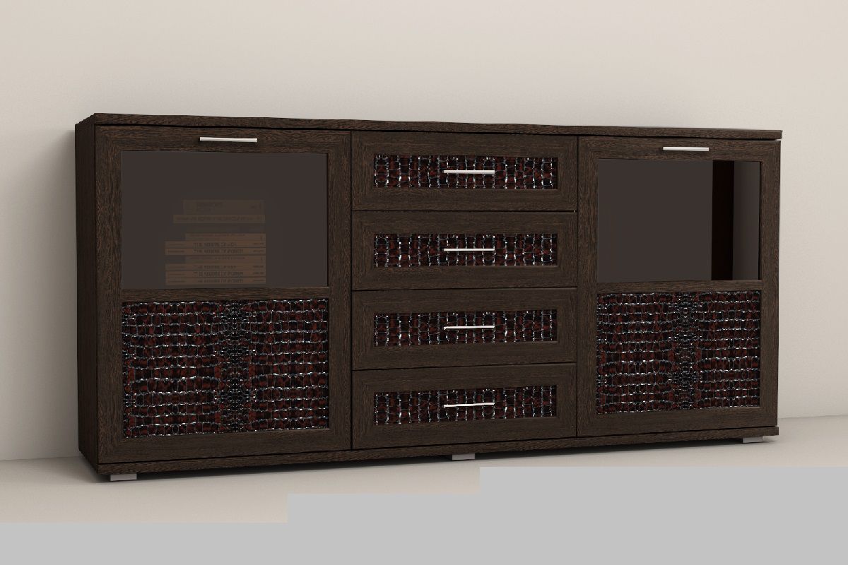 Фасады ящиков отделаны высокачественной искусственной кожей с тиснением под рептилию и погонажного рамочного профиля МДФ, покрытого финиш-плёнкой, что придаёт необычность и оригинальный внешний вид этой модели. Стёкла в дверцах имеют лёгкую заводскую тонировку.