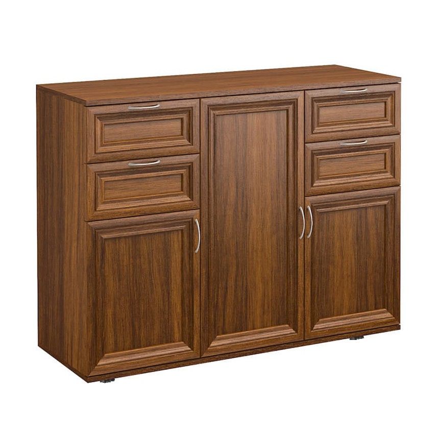 Комод разделён на три равные части. Четыре выдвижных ящика расположены попарно симметрично в верхней части первой и третьей секции, под ними расположены отделения с распашными дверями. Средняя колонка имеет распашную дверь, за которой установлены две внутренние полки.