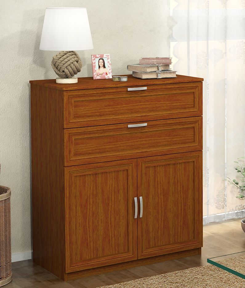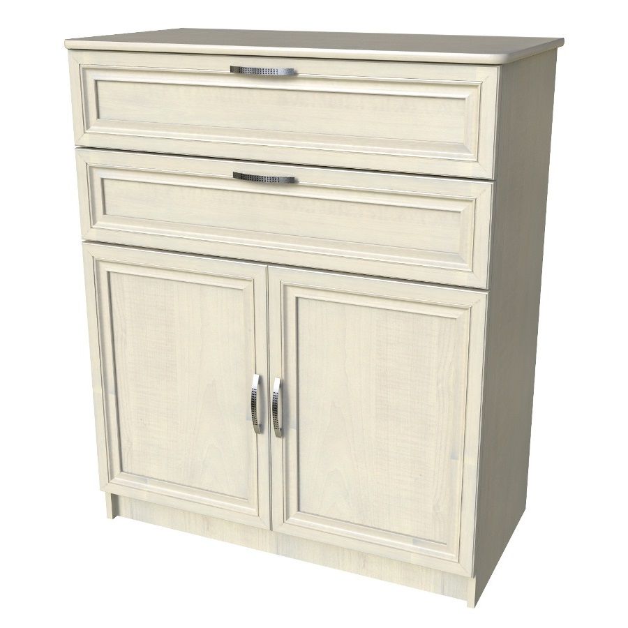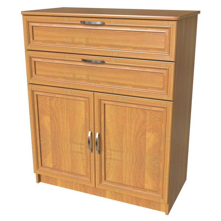 Комод разделен на две секции: верхнюю - с двумя выдвижными ящиками и нижнюю - с двумя распашными дверями, за которыми установлена одна внутренняя полка.