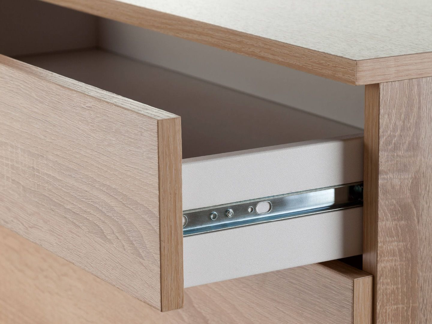 Выдвижные ящики установлены на шариковые направляющие и оборудованы металлическими ручками.