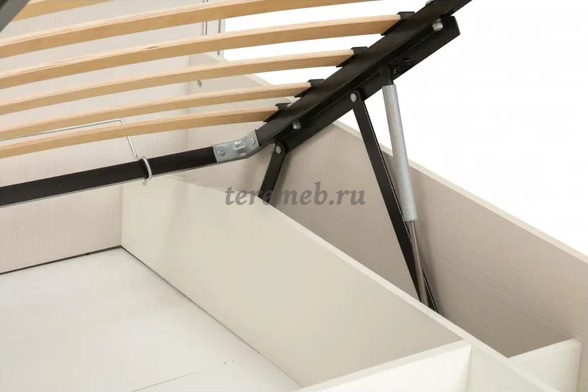 Конструкция кровати оснащена удобным механизмом, который позволяет легко поднимать нижний край основания кровати - под ним расположен просторный блок для хранения белья.