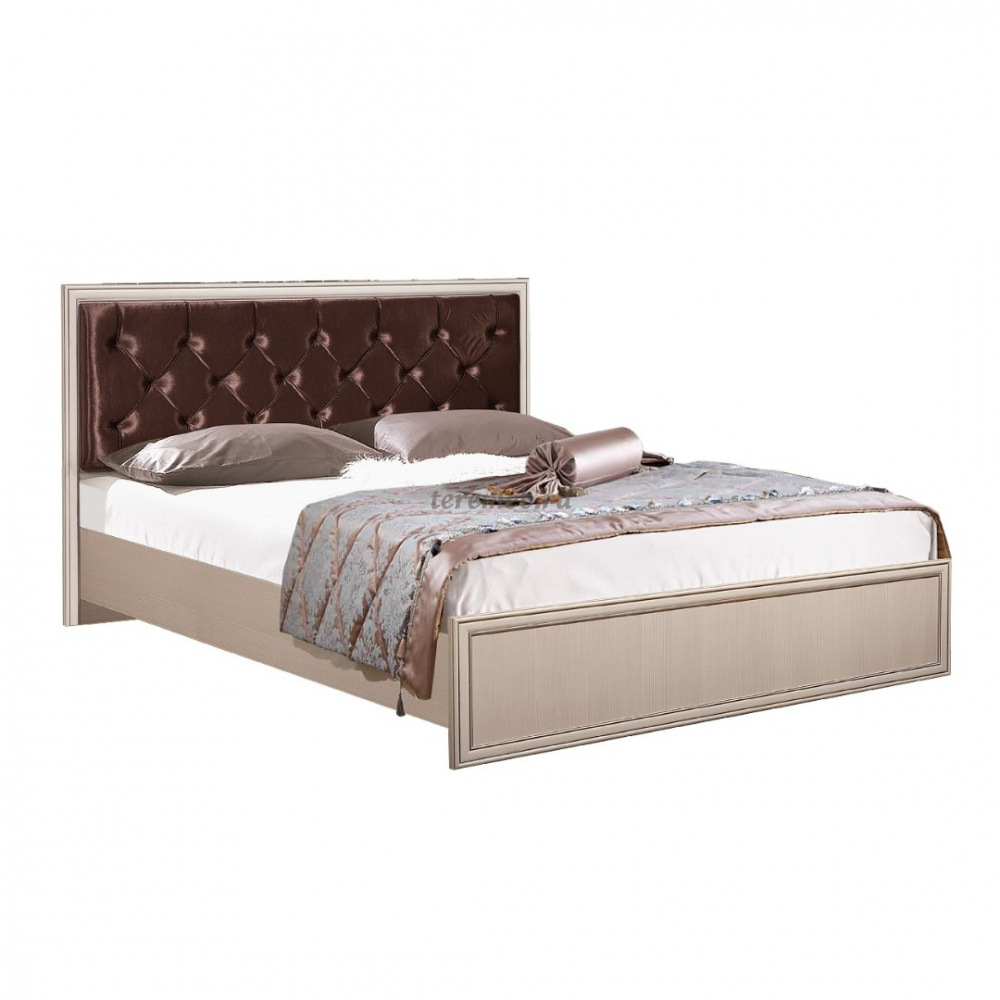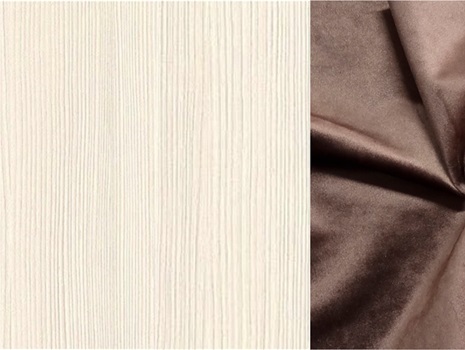 Головная спинка отделана высокачественной тканью с тиснением и погонажным рамочным профилем из МДФ, покрытого финиш-плёнкой, что придаёт необычность и оригинальный внешний вид этой модели.
