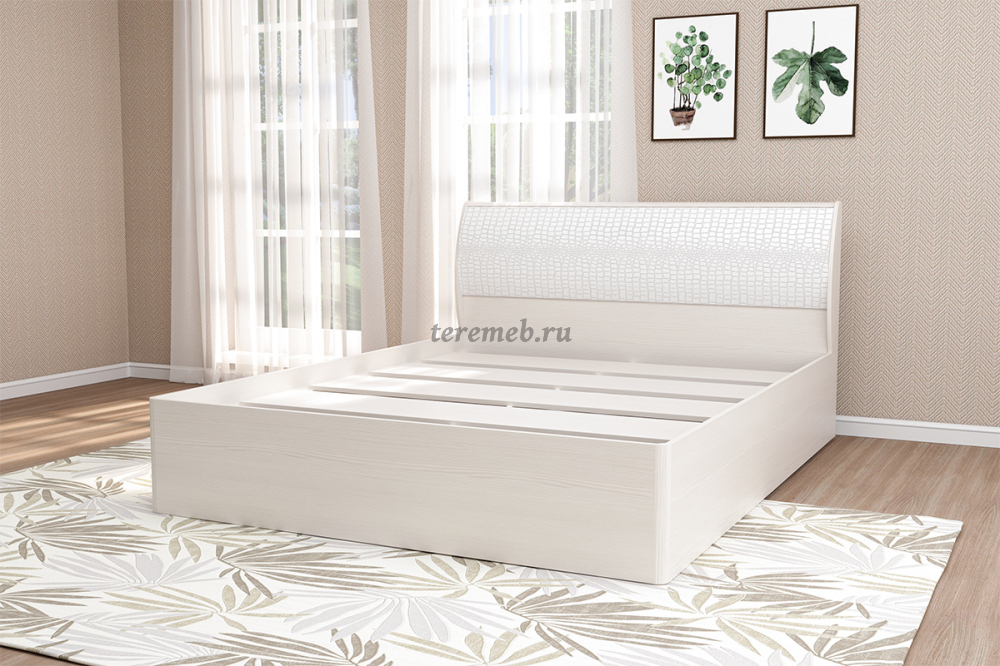 Головная спинка отделана высокачественной экокожей с тиснением под рептилию и погонажным рамочным профилем из МДФ, покрытого финиш-плёнкой, что придаёт необычность и оригинальный внешний вид этой модели.
